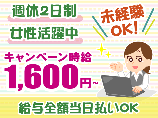 未経験者歓迎!人気の一般事務のお仕事! 週休2日制/車・バイク通勤可/全額当日払いOK/女性活躍中