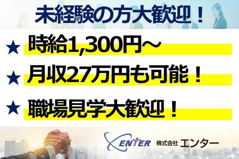 【応募の流れ】 【STEP.1】応募 ▼ 【STEP.2】担当者より、面接日時等のご連絡 ▼ 【STEP.3】面接 就業先のご説明等させていただきます。分からないこと、不安なこと、何でもご相談ください。 ▼ 【STEP.4】内定! ■面接日・入社日は相談に応じます! まずはお気軽にご応募ください。 アクセス(勤務地) 所在地 愛知県安城市 アクセス(面接地) 所在地 愛知県安城市今池町2-1-41 畑ビル3F アクセス 名鉄名古屋本線 新安城駅より徒歩10分 【応募方法】 ※出張面接またはWeb面接も可能です! 「応募へ進む」又はお電話にてご応募ください。 ■電話からのご応募・お問い合わせ 株式会社エンター TEL:0566-91-7733 受付時間/10:00~17:00の間にお願いします。 ■WEBからのご応募 応募へ進むを押し、必要事項をご入力の上ご応募ください。 ⏩️【出張面接またはWeb面接も!】 場所はカフェや落ち着ける場所での実施もOK!リラックスできるカジュアル面談を心がけておりますので、堅苦しい雰囲気は一切なし。 お互いにリラックスしながら、お話しできればと思います。ぜひお気軽にご相談ください。 ⏩️【職場見学可能!】 入社する前に実際に働くスタッフ・会社をぜひ見学してください。 実際に勤務する場所を見ることによって安心してお仕事できると思います。 職場見学や面談を通し、不安を全て解消してから入社が可能です。