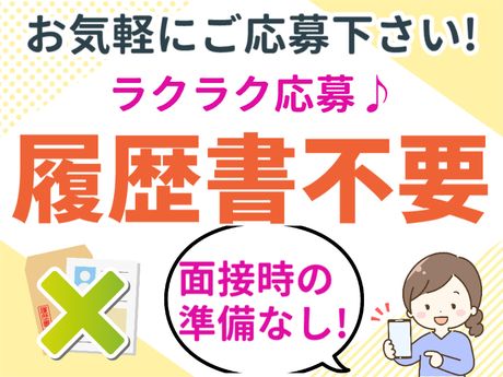 選考プロセス ★履歴書不要でラクラク応募★ 面談時は服装自由!普段着でOKです♪ 「話だけでも聞いてみたい」などもOK! \まずはお気軽にご応募ください!/ ■ 応募後の流れ (1)ご応募 (2)担当よりご連絡(当日~翌日) └担当者よりご連絡する際、携帯電話からお電話させていただく場合がございます。 (3)面談・お仕事のご案内 (4)職場見学(担当が同行します♪) (5)お仕事スタート! ★職場を見てから決められるので安心です! ★疑問や不安は事前に解消できます! ★在職中の方も、面談日程など柔軟に調整しますのでお気軽にご相談ください♪ 【問合せ先について】 問合せ先:0120-557-053 応募方法 【WEB応募】 「応募画面へ進む」ボタンより必要事項を入力の上、送信ください。 【TEL応募】 0120-557-053 ■受付時間:9:00~18:00 お気軽にお電話ください♪