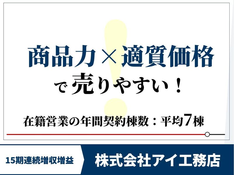 仕事内容 ++・・・・・・・・・・・・・・・・++ 注文住宅・ハウスメーカー営業経験の スキルを最大に活かせるアイ工務店 ++・・・・・・・・・・・・・・・・++ 【仕事内容】  ̄ ̄ ̄ ̄ ̄ ̄ ̄ ̄ ̄ ̄ ̄ ̄ ̄ ̄ ̄ ̄ ̄ ̄ 木造注文住宅の企画・提案をお任せします。 わたしたちの仕事のスタイルは… ⏩100%反響営業 モデルルームに来場されたお客様や SNSやHPを見てお問い合わせいただいた お客様へのご案内となります。 100%反響営業(飛び込みなし)で、 月ごとの個人ノルマもありません。 ⏩一気通貫型 当社では営業・設計・積算を一人で担当する 「一気通貫型」の営業スタイルを 採用しています。 お客様への対応がスピーディになり、 契約に繋がりやすく、分業制では得られない 幅広いスキルも身につきます。 【中途入社者が実感する魅力】  ̄ ̄ ̄ ̄ ̄ ̄ ̄ ̄ ̄ ̄ ̄ ̄ ̄ ̄ ̄ ̄ ̄ ̄ 中途入社者の約7割が住宅業界経験者です。 経験者だからこそ実感する アイ工務店の魅力をご紹介します。 |◤明確な評価制度◢| 明確なルールに基づき、経歴や勤続年数に 関わらず、自身の頑張りがダイレクトに 給与に反映されます。 ◆売上棟数・金額で給与・役職を決定 ◆契約1件ごとにインセンティブを支給 半年間の引渡金額が一定を超えると インセンティブが【倍増】します。 ◆入社1~3年で営業所長へ昇進した実績多数 |◤高品質×適質価格の商品力◢| 「この品質でこの価格なら、売れて当然!」 と業界他社からの入社者も納得の 商品力があります。 ◆商品に自信あり! だからこそ1人あたり年間契約棟数が 業界平均3~4棟といわれているなか、 当社の平均は7棟、50%以上の営業が 年間7棟以上の契約をいただいております。 ※入社1年目の社員も含む |◤業界トップクラスの成長率◢| 2010年の設立以来、15期連続の増収増益を達成。 今なお成長を続ける、勢いのある会社です。 ◆売上高は2010億円に達しています。 ◆高い収益性(利益率10%超) ◆健全な財務体質(自己資本比率50%超) ◆全国300以上の拠点を展開。 ◆2026年6月末までに330拠点体制を 目指しています。 ◆事業拡大に伴い、管理職ポストも豊富にご用意! 実力次第で入社後数年での昇格も可能です。 |◤ワークライフバランスの実現◢| メリハリのある環境で、仕事と 私生活を両立。40代・50代が長く 活躍できる環境を整えています。 ◆完全週休2日制 ◆長期休暇あり (年末年始16日間の実績) ◆転勤なし(希望勤務地で活躍可能) ◆生産性向上の取り組み 不要な会議を削減し、営業管理の 自動化を推進 【中途入社者の声】  ̄ ̄ ̄ ̄ ̄ ̄ ̄ ̄ ̄ ̄ ̄ ̄ ̄ ̄ ̄ ̄ ̄ ̄ ✅前職:大手住宅メーカー営業(40代) 前職では、成果を出す・出さないに 関わらず、毎年昇給していくという 年功序列な制度でした。 当社には『係長』として入社。 『年間8棟』という明確な昇格基準を 2年連続でクリアし、『部長』に昇進。 年齢や社歴ではなく、成果を正当に 評価してくれる環境に満足しています。 ✅前職:地場工務店営業(30代) 前職では分業制のため、お客様の希望の スケジュールに沿った提案ができませんでした。 アイ工務店では自分のペースでプラン作成や 見積り提案などスケジュールが調整しやすい ところにも満足しています。 給与も自分の頑張りを直接評価してもらえる システムなため、頑張りがいがあります。 休みの日についても自由に申し出ができ、 家族との時間も調整しやすいです。 子供の長期休みには様々なイベントがあり、 春や夏にBBQ、冬は豪華な会場を貸切った パーティーなども開催。 家族と一緒に参加できるイベントもあり、 毎年家族も楽しみにしてくれています。 ✅前職:ハウスメーカー営業(30代) 前の会社では契約を取ってもすぐに給料が 上がる事はなく、毎年少しずつ上がっていく 給与形態でした。 アイ工務店では自分が頑張った分だけ 給料に反映され、頑張れば20代、30代でも 稼ぐことができます。 実際に自身も、入社してから給料が増え、 生活水準が上がったと実感しています。 また社員旅行が年に1度あり、 初めての海外旅行も経験できました。 給与形態はもちろん、それ以外でも 仕事をまた頑張ろうと思えるような 環境があると感じています。