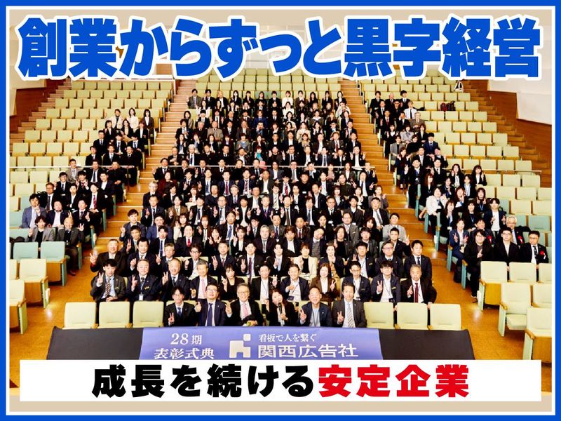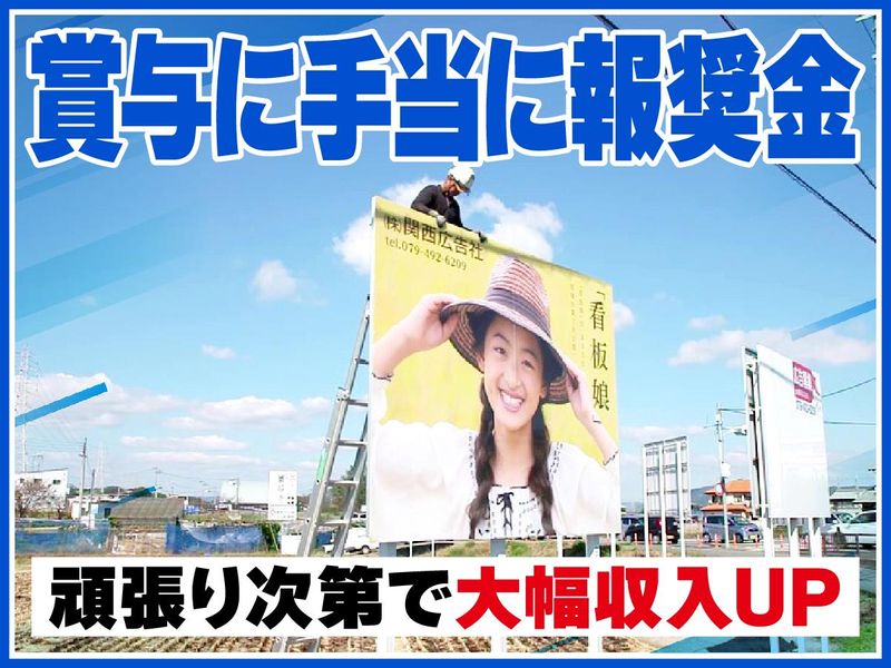 仕事内容 <求人のおすすめポイント> ★2年目年収例460万円!賞与は年3回 ☆土日祝休み&17時定時で残業少なめ ★未経験からひとつずつ学べる研修あり ☆報奨金や食事会などウレシイ制度多数 「給与も休みも福利厚生も、 頑張る社員にはどんどん与える! そうすれば皆やる気が出て、 仕事を頑張れるから業績が上がる」 私たち関西広告社は、 そうやって大きくなった会社です。 創業から33年間ずっと、黒字経営を継続。 年間の純売上金額は、 毎年過去最高を更新しています。 だから私たちはこれからも、 頑張る社員に与えることを惜しみません。 今以上の収入も、プライベートの充実も、 しっかりやれば必ず叶うのが当社。 実際に転職してきた社員たちは 「仕事だから大変な時もあるけれど、 貰えるものが大きいから頑張れる」 と語っています。 / ”頑張りが報われる制度”を、 少しだけご紹介! \ 【その1】目標達成で収入UP 「看板を立てる件数」などには目標があり、 達成できれば月給や賞与とは別に報奨金が! 多ければ一度に30万円以上もらえます。 【その2】定時前でも退社OK その日にやるべきことが終わったら、 17時になっていなくても退社できます。 テキパキやることを片付けて、 仕事終わりを充実させている社員多数! =========== ■仕事内容について =========== 当社は道路や街中で見かける、 広告看板を扱う会社です。 あなたには施工スタッフとして、 下記のような業務をお任せします。 ●看板の設置 ┗柱を立てたり取り付けたりなど、 屋外での作業になります。 ●看板の製作 ┗板にシートを貼るといった、 社内での準備作業になります。 ●メンテナンス業務 ┗色あせた看板の張り替えや、 邪魔な草木の伐採など。 【よくある1日の流れは…】 朝は施工所に出勤。 資材などを積んだトラックで、現場に出発! ▼ 現場に着いたらまず、 看板の柱を立てる穴掘りからスタート。 穴ができたら柱を立てて コンクリートを流し込んだら、 午前の作業は終了です。 ▼ お昼休憩をはさんで、 午後からは看板の取り付けです。 高所作業車やクレーンなども使いながら、 チームで協力し看板を完成させます。 ▼ 現場作業が終わったら、14~15時ごろに帰社。 事務処理や資材・機材の片付けをします。 ▼ 翌日使うものをトラックに積み込んだら、 1日の業務終了! 看板を立てるのではなく 貼り替えといったメンテナンスの場合は、 もっと早く作業が終わります。 その際は現場を2件回ったり、 午後から社内で看板づくりをしたりします。 =========== ■入社後のステップUPについて =========== 当社では自動車教習所のように、 段階を踏んで成長できる 研修プログラムを用意しています。 次の目標が分かりやすく書かれているので、 迷わずステップUPできますよ! もちろん、できることが増えれば 給与もUPしていきます! / とある先輩に聞いた、 入社後のステップUPは… \ 最初は穴掘りからスタート。 パワーは要りますが、 僕は身体を動かすのが好きなので 割とスグに馴染めました。 ▼ 次は高所作業に挑戦。 僕は高いところが得意なので、 入社後2~3ヶ月でだいたいマスター。 とはいえ高所が得意でない人も、 半年程度で慣れると思います。 ▼ 入社後1年程度で 一通りの作業ができるように。 慣れるまで何度も失敗しましたが、 先輩がその都度丁寧に教えてくれたので 成長することができました! ▼ 重機の動かし方などは、 2年目以降も練習中。 出来ることはどんどん増やしていけるので、 飽きることがありません。 =========== ■仕事のモチベになるイベント多数 =========== 観劇と豪華食事がプレゼントされる 毎月の誕生日会ほか、 社員の家族も参加できるイベントも。 最近だと人気テーマパークのレストランで、 貸し切りパーティーを開催しました。 また年間でいい成果を残せたら、 報奨旅行に行くチャンスもあります。 その際は食事代はもちろん、 お土産などに使えるお小遣いまで会社持ち! =========== ■当社関西広告社について =========== 屋外広告看板の分野で安定経営を続ける、 業界トップクラス企業です。 広告の企画制作から設置・メンテナンスまで 一貫した対応ができるのが強み。 現在31の営業所を展開し、 全国5000社との取引実績があります。 信用調査会社の評点では 中小企業の上位3%にランクイン! 安心して勤務していただけます。