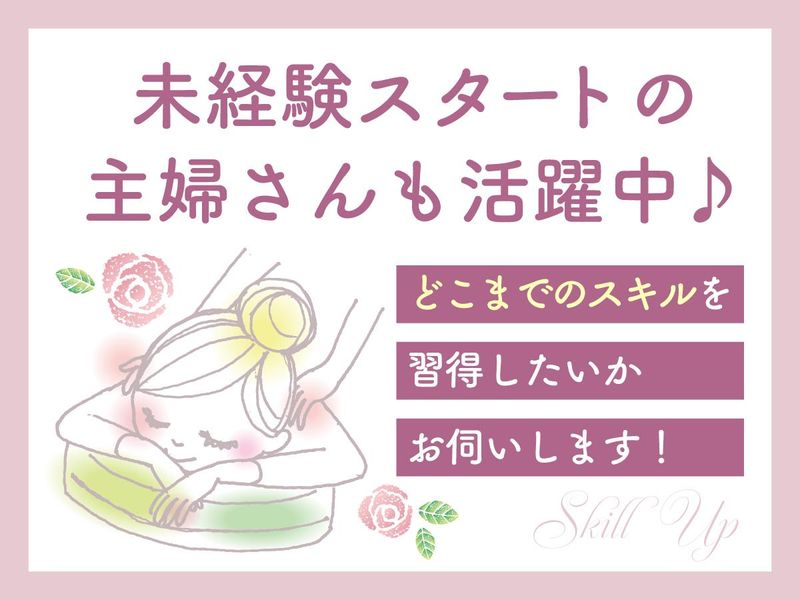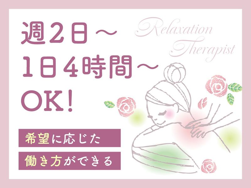 仕事内容 本業だけでは収入が物足りないから 副業したいけど…。歩合制だと お客様が来ないと稼げないよね? ▼▼▼ その心配、ごもっとも! 施術1件ごとに報酬が発生するので お客様の数が気になるのは当然です☆ その点、当店なら大丈夫! 夜の時間は、店長一人ですべてに 対応しきれないほど、 多くのお客様が来てくださいます♪ 寒い1・2月の閑散期が終わり、 これからどんどんお客様が増えていきます。 それに伴って、スタッフを増員募集! 多い日で5名のお客様を担当して いただくので… ボディ60分1641円×5で日収8205円☆ 週2日(月8日)勤務で月収6万5640円☆ 本業だけでは足りない収入も これで十分補えますね♪ ◆無料受講の研修から*・*・*・*・◆ □ボディーコース リンパの流れに沿って筋肉を大きく マッサージ*疲れをリフレッシュ! □フットコース 足の裏のツボを刺激して血行を よくすることで、むくみを緩和♪ □アロマオイルコース □ハンドケアコース □ドライヘッドスパコース □ジェルコース 多彩なコースが学べるので 「本業ではやったことがない」なんて 施術もできるようになりますよ♪ 収入アップだけじゃなく スキルアップまでできてかなりオトク! 研修期間は10:30~17:00の 時間帯固定で平日のみ、連続10日間 実施します。集中して学べるので しっかり力をつけて、即店舗デビュー* ◆フリーのお客様は平等に*・*・*・◆ お店のメルマガやSNSでの情報発信で リピーターさんの来店に繋げるなど 集客はお店が担当します。自分で集客する 必要はなく、施術に専念できますよ♪ また、スタッフの指名がない フリーのお客様は、出勤中のスタッフ 全員に公平に割り当てています。 お客様の取り合いがなく、スタッフ同士の 関係も良好♪全然ギスギスしてません☆ ちなみに夜は店長が一人で シフトに入ることが多いので、 あなたも夜に入ってくれれば 自動的に担当するお客様の人数も多数! 稼ぐなら、断然「夜」ですね♪