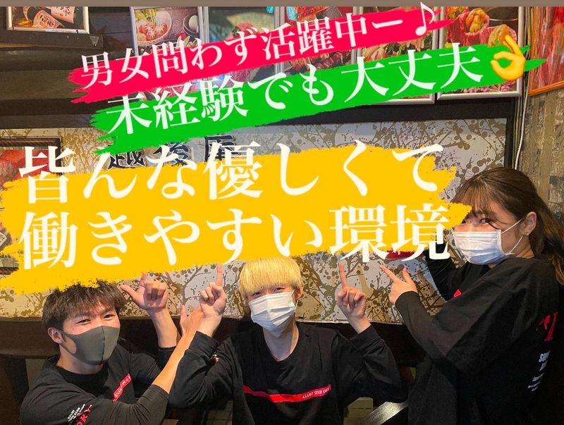 職場環境 「飲食店で働くのが初めて」 という方も大歓迎! 先輩スタッフが親切丁寧に 教えますのでご安心ください もちろん飲食店での 勤務経験がある方も歓迎です! 喫煙所:喫煙所あり(屋内)