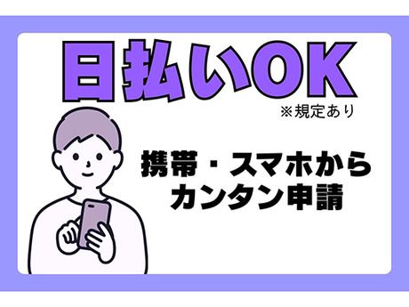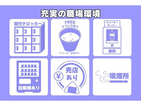 【保険制度】 雇用保険、労災保険 待遇・福利厚生 【福利厚生】 ・雇用保険、労災保険あり ※加入要件を満たす場合は 健康保険、厚生年金あり(法令による) ・交通費支給(2450円/日) ・日払い制度有(規定あり) ・研修制度あり ・残業手当あり ・服装/髪色自由(規定あり) ・有給休暇(規定あり) ・産休・育休制度あり ・健康診断あり(会社負担) ・自転車通勤OK(無料駐輪場あり) ・無料送迎あり(新横浜駅より運行中) ・休憩室 ・喫煙所 ・鍵付きロッカー ・ウォーターサーバー ・フリードリンク(スープ、ジュース、お茶など) ・自動販売機 ・売店あり ・お弁当持参OK (保管用冷蔵庫、電子レンジ、給湯ポット)