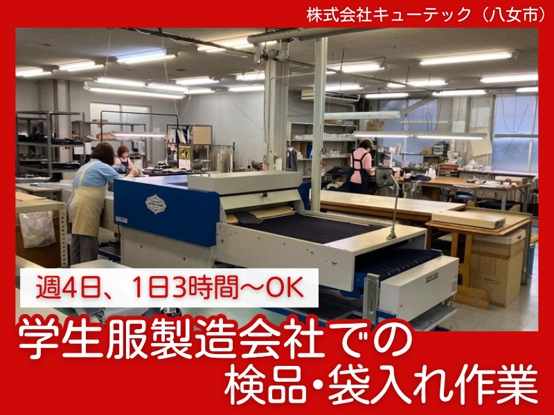 仕事内容 主に学生服(ブレザー等)の製造を行っている 会社で検品作業、袋入れ作業をお願いします。 女子用の学生服(主にブレザー)を製造して います。30名以上のスタッフがパーツ毎に 分かれて分担して作業しています。 担当間の連携も取れており、バックアップ 体制は万全!縫製経験者が経験を活かして 活躍できる職場です。 *+ココが注目ポイント+*  ̄ ̄ ̄ ̄ ̄ ̄ ̄ ̄ ̄ ̄ ̄ ̄ ̄ ◆ブレザーの製造がメインで、 大きな製品はほとんどなく 力作業もありません ◆屋内での作業になるので、 暑い日も寒い日も快適です! ////////////////////////////////////////// 【株式会社キューテックとは】 福岡県八女市に本社を置く創業55年を超える学生服製造会社です。 従業員の働きやすさを第一に考え「残業なし」「清潔な職場環境」など、日々、快適な職場づくりを意識しています。 //////////////////////////////////////////