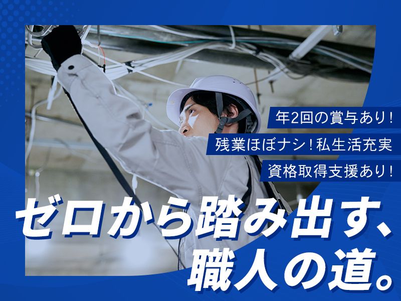 仕事内容 \ 未経験入社8割以上 / ・-・-・-・-・-・-・-・-・ 安心の教育体制で、 成長をしっかりサポート! ゼロから、 電気工事のプロを目指そう! ・-・-・-・-・-・-・-・-・ << 魅力POINT >> ✅丁寧なマンツーマンOJT研修 ✅賞与年2回+業績賞与あり ✅残業ほぼゼロ(実働7.5時間) ✅家庭都合休OK ✅異業種からの転職者も活躍中 (建築・工場・ITなど実績多数) ✅幅広い業務に挑戦できる! ✅30~50代中心の落ち着いた職場 ✅直行直帰可能! ※案件による << 仕事内容 >> 電気工事士として以下の業務を行います。 まずは、簡単な補助業務からスタート! 段階的に、ステップアップが可能です! ※工具の名前を覚える、現場の掃除、先輩のサポートなど! 具体的には… ・某企業建物内の改修電気工事 ・一般電気工事 ・空調衛生計装工事 ・セキュリティー工事 ・消防設備工事 ・通信工事 ・放送設備工事 ・TV共聴設備工事 ※出張あり(ごくまれです) ●対応エリア:大阪市内がメインになります ●移動時間:平均1時間範囲以内