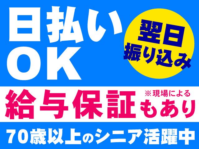 【保険制度】 雇用保険、労災保険、健康保険、厚生年金 待遇 〇社会保険完備 〇交通費支給 〇寮完備(即入居可) 〇研修制度有(20時間/3日24,000円) 〇制服貸与 〇バイク・自転車通勤OK 〇正社員登用制度有 〇週払い制度有 〇前払い・仮払い応相談 〇日払いOK(翌日振り込み) 〇日給保証有(現場による) 〇資格取得支援サポート有 〇入社祝金5万円支給(規定有) 〇面接交通費支給(初回のみ) 〇直行直帰可