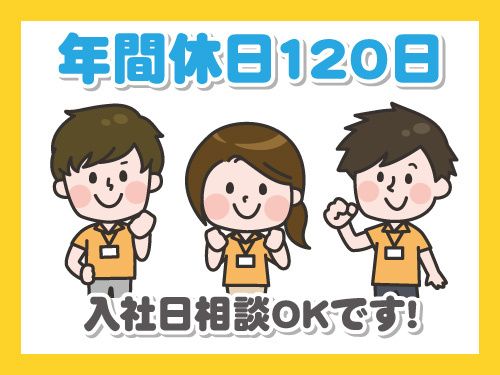 休日 シフト制(応相談) ※年間休日120日 ※正月(5日間)・夏季(3日間)の休暇あり ※6ヶ月経過後の年次有給休暇日数:10日