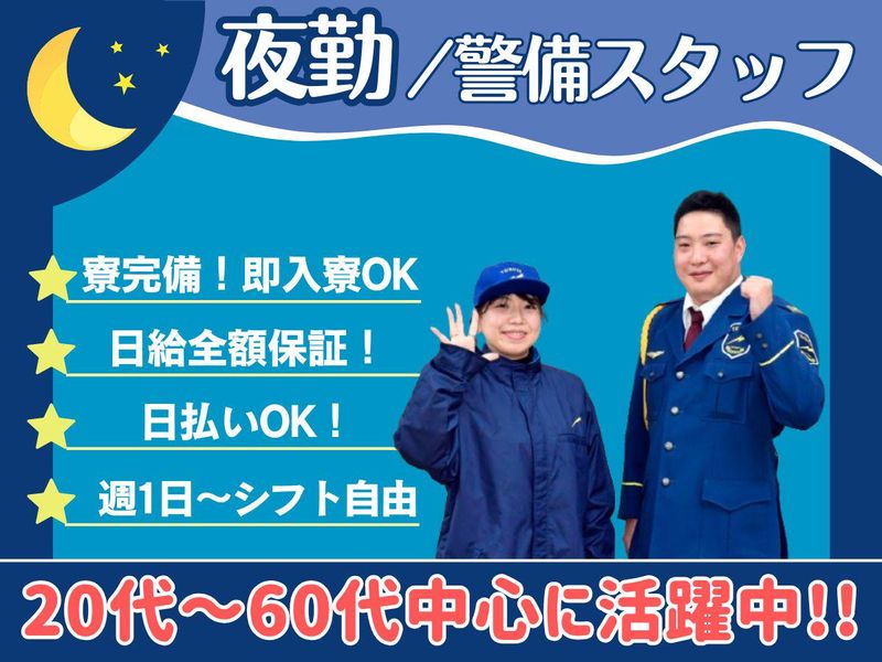 仕事内容 \4月から勤務開始❗/ 春からのスタートで新生活を応援✊❗ ⭐ テイシンは働きやすさに自信あり ⭐ ⸜⸜未経験の方も安心して働ける環境です⸝⸝  ̄ ̄ ̄ ̄ ̄ ̄ ̄ ̄ ̄ ̄ ̄ ̄ ̄ ̄ ̄ ̄ ✅日払い・現金手渡しOK! ✅早上がりでも日給全額保証 ✅週1日~OK! ✅寮完備!即入居可! ✅昼食付♪3日間の事前研修(1日7時間)あり◎ ✅履歴書不要!飛び込み面接OK! ✅気になった方はお電話ください❕❕ TEL▶03-5913-9788 ◆―――――――◇◆◇―――――――◆ <✨履歴書・面接不要の簡易選考あり✨> 応募はとってもカンタン! 携帯に届く専用フォームに 答えるだけで完了♪ 内容を確認後、 担当者からすぐご連絡いたします! ◆―――――――◇◆◇―――――――◆ 夜勤・警備スタッフ大募集❗❗ (。・ω・)尸━━━━━━━━━━━━━⭐ 工事現場などでの、通行人や車の 誘導・案内をお願いします。 住宅街の現場が中心で交通量も少ないため、 交通誘導が初めての方も安心して働けます。 ※その他にも施設警備の案件や 土日祝はイベント警備の案件も多数! ★代表的な1日の流れ(例)★ 21:00 集合して車で現場に移動 21:30 担当エリアで警備開始 23:00 15分休憩 01:00 休憩(1時間) 04:00 15分休憩 06:00 車で集合場所に移動・解散 ※直行直帰OK ━━━━━━━━━━━━━━━━━━━ ◤ ̄ ̄ ̄ ̄ ̄ ̄ ̄ ̄ ̄ ̄◥ ⚡現場の声をお届け!⚡ ◣__________◢ ⏩60代男性スタッフ こまめに休憩があるおかげで、 体への負担を感じにくく 安心して働けています。 定年後の再雇用制度(71歳まで)もあり、 長く安定して働くことができます。 周囲のフォロー体制も整っているので 無理なく続けられ、 今では10年目になりました。 ━━━━━━━━━━━━━━━━━━━ ⭐無理なく勤務可能⭐ 履歴書の空白や、転職回数を 気にする必要はありません。 50代・60代からスタートし 「ここが最後の仕事」と働くスタッフが多数。 等身大のあなたで活躍しませんか? 「年齢で断られた」 「今さら新しい仕事は不安」 そんな気持ちを抱えている方こそ、 ぜひご応募ください。 ⭐"楽しく働くこと"がモットー⭐ 仕事や収入、プライベートなことまで 何でも相談できるあたたかい職場環境♫ わからないことはスグに相談できます❕ 気さくで優しい先輩たちが歓迎します。 ⭐日払い現金手渡しOK◎⭐ 日払いOK!現金手渡しOKなので、 急な出費にもバッチリ対応! 頑張った分の報酬がその場で受け取れます♪ ⭐事前研修を経て安心デビュー⭐ 初日からいきなり現場に出る! なんてことは絶対にありません。 現場に出る前に丁寧な研修があるので、 初めての方も安心してスタートできます♪ ⭐まずはお気軽にお電話ください⭐ お問合せだけもOK!☎03-5913-9788まで お電話お待ちしています♫ ╭━━━━━━━━━━━╮ ⭐東京都内に現場多数あり⭐ ╰━━━━━━━━━━━╯ 東京都内に100ヶ所以上の現場があります! 「家の近くで働きたい!」 「直行直帰で働きたい!」 など、お気軽にご相談下さい♪