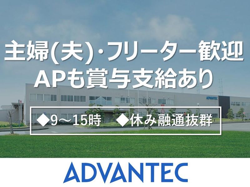 仕事内容 \未経験OK!製造パートさんは99%女性/ 平日9~15時でできるコツコツ工場作業! 工場勤務デビューにもオススメですよ。 〇完全土日祝休み!年間休日123日 〇月の平均残業は計2時間!残業少なめ 〇家庭との両立応援!お休み調整も可能です 〇職場見学もOK! -------------------- 【 仕事内容 】 濾紙(ろし)・フィルター製品の 製造&品質管理をお任せ! ※配属先は希望・適性を考慮 ※各工程、チーム作業がメイン (1)濾紙の製造・加工 *機械から出てきた紙をカット・並べる *ゴミがついていないかチェック *機械での数カウント、袋詰め ※簡単なPCデータ入力作業あり (2)フィルターの製造 *フィルターを加工する機械の操作 *汚れや傷がないか外観チェック (3)濾過(ろか)器の製造 *ガラス、ステンレス品の外観チェック *結果の記録、その他書類作成 (4)品質チェック・品質管理 *製品の外観・サイズの簡単なチェック *不良品の選別・結果の記録 -------------------- 【未経験でも安心】 簡単な作業がメイン!先輩がしっかり サポートするのでご安心くださいね。 \\ 長期歓迎*安定性もバツグン! // 濾紙やフィルターなどの製品は、 食品・お薬・化学製品などを つくるときには欠かせないもの。 安定した需要があり、安定して働けます! -------------------- \\社長よりコメントをいただきました// [ ADVANTECグループの中核会社 ] 2017年7月に創業100周年を迎え、新たな 歴史を刻むための一歩を踏み出しています。 常に時代のニーズをとらえて、アドバンスド テクノロジーを追求、ラボからプロセスまで ワンストップでお客様の未来に貢献し、 「濾過技術と、科学機器のベストパートナー」 として歩み続けたいと日々願っております。 ※ADVANTEC(HP):www.advantec.co.jp/