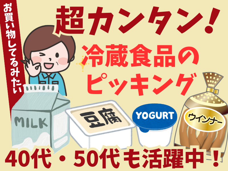 仕事内容 <ここがおすすめポイント> ⭐即面接・即採用OK! ⭐体への負担少なめ!シニア応援♪ ⭐ご自身の希望に合わせた シフトを選択できます! ⭐服装自由!髪型自由! ⭐日・祝は時給50円UP! - <仕事内容> 冷蔵庫内にて 注文通りに商品を仕分ける ピッキング作業です。 <具体的には> リストにある商品を指示通りにカゴに 入れるだけ!「お買い物」の延長線上で できるお仕事です。難しい知識も、 特別な資格も一切必要ありません。 扱うのはスーパーでおなじみの豆腐、 乳製品などのチルド食品。 重たい荷物を運ぶような激しい動きは ないので、体への負担を気にする 必要はありません。 女性スタッフやシニア世代も活躍 されていますよ♪ - ✅年中快適なクリーンな職場 冷蔵倉庫内なので、夏場のうだるような 暑さも、冬の厳しい外気も関係なし。 会社支給の防寒着があるため、常に 「適温」で集中して働けます。 - ✅今すぐ!に応えるスピード対応 即面接・即採用も可能です。 応募から勤務開始まで最短1週間なので 「急ぎで仕事を探している」 「空白期間を作りたくない」 という方に最適! - ✅簡単作業なのですぐに覚えられます *初日からできる超簡単作業です *分からない事は先輩がサポートします *業界・職種未経験、積極的に採用中! 慣れてきたら仕分け作業だけでなく 商品の入荷・出荷チェック、 検品、在庫管理などを お願いすることもあります。 - ✅選べる3つのワークスタイル 「しっかり稼ぎたい」 「プライベート優先」など、 あなたにぴったりの枠を1つ選んで下さい ✨安定のレギュラーワーク✨ 【勤務時間】14:00 ~ 23:00 月収20万円以上も可能。 社保完備で安定感抜群。 フリーターさん活躍中! ✨家事や育児の合間に✨ 【勤務時間】15:00 ~ 20:00 週3日~OK。 家事との両立や、扶養内での調整に ぴったりな時間帯です。 ✨深夜の副業・Wワークに✨ 【勤務時間】19:00 ~ 22:00 Wワークに最適。 会社帰りや、夜の時間を有効活用して プラスアルファの収入に。 ご希望の働き方を面接時に 教えてくださいね◎