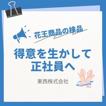 職場環境 【従業員構成】 ※請負職場につき雇用は東西株式会社、就業先は請負先企業様の現場となります。 60名以上のスタッフさんが働いてくださっています。 平均年齢55歳。男女比3:7の職場です。 職場環境は花王工場敷地内セット加工エリア。 休憩室完備でオンオフしっかりと過ごせますよ♪ 喫煙所:喫煙所あり(屋外) 屋外専用スペースになります。 共有スペースになりますのでルールを守っての利用をお願いします。 ※衛生用品製造の為、ネイル不可、マスク着用、ニトリルゴム手袋着用が出来ない方はご遠慮いただいております。 【職場の雰囲気】 にぎやかな職場 協調性がある アットホーム 決められた時間できっちり