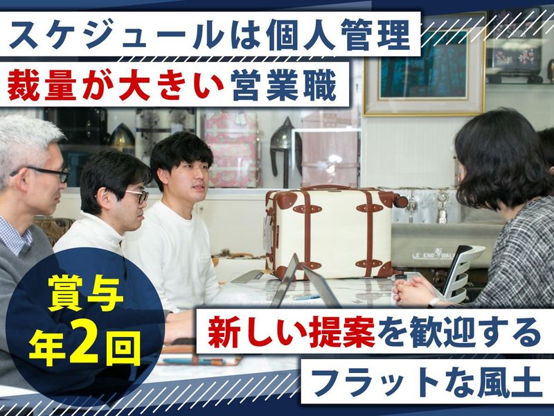 仕事内容 / あなたの発想力を活かせるルート営業 \ ◆ 営業経験を活かして さらなるキャリアアップ ◆ 直行直帰・リモートワーク対応可 ◆ 新作スーツケースの貸与あり 当社は、旅行や出張の必需品である スーツケース・トラベルグッズの 企画・製造・販売を行う企業です。 今回は、全国の取引先 (大手量販店・旅行用品専門店など) に向けて、自社商品の提案を行う 【営業職】を募集します。 < お仕事内容 > □ 既存商品・新商品の提案 □ 売り場レイアウトの企画・提案 □ 提案資料・見積書の作成 □ 在庫管理・売上管理 など 担当スタッフ一人ひとりに裁量があり、 働き方は個々のスタイルに応じて 柔軟に調整可能。 直行直帰やリモートワークを活用しながら、 効率的かつ主体的に 営業活動に取り組めます。 また、新しいアイデアや提案も 積極的に歓迎される風土があり、 自分の考えをダイレクトに 仕事へ反映できる環境です。 入社後、まずは実際に倉庫で 検品をしていただくなど 商品の理解を深めていただく所から スタートいたしますので 「業界未経験だし不安だな…」 という方もご安心ください。 また、ルート営業で引継ぎ案件が ほとんどなので 人と話すことが好きな方であれば あっという間に慣れることが 出来ると思います◎ / 転職者インタビュー 営業職としての新たな挑戦 \ 以前は営業職に就いていましたが、 給与体系や評価制度に不満があり、 転職を決意しました。 旅行が趣味でスーツケースにも 馴染みがあったため、 興味を持ち、当社に応募しました。 入社後は、これまでの営業経験を 活かせる環境が整っており、 努力が確実に成果として報われる点に やりがいを感じています。 社内は相談しやすい雰囲気があり、 営業スキルも入社当初に比べて 大きく成長できたと実感しています。 1年目で年収も向上し、 念願だった自動車を購入できました。 自分のペースで挑戦し、 成長できる環境が整っている点が、 当社の魅力だと思います。 (20代・男性/営業職) / 若手が活躍する、成長企業です \ 当社では現在、 20代~30代前半の若手社員が 中心となって活躍しています。 当社では単なる販売活動にとどまらず、 顧客のニーズに真摯に向き合い、 「こういった製品があれば より便利で快適になる」 という発想をもとに、 オリジナルのスーツケースや トラベルグッズを 企画・開発しています。 今回は、そうした自社開発製品の魅力を、 取引先に対して提案・展開していただく 【営業職】の募集となります。 「この提案は面白そうだ」 「より魅力的な売り場づくりを提案したい」 「新たな販路を開拓してみたい」 ――そうした主体的な発想や 行動力を歓迎し、 実現できる環境が当社にはあります。 お客様と真摯に向き合いながら、 自らのアイデアを提案・実行できる方を お待ちしています。 経験の有無は問いません。 意欲のある方には周囲が丁寧にサポートし、 成長を後押しいたします。 自由度の高い営業スタイルのもと、 自分らしいキャリアを築きたい方には 最適な職場です!