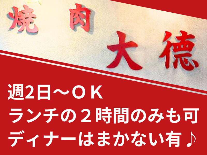 仕事内容 ●●焼肉 大徳でのホール業務●● 先輩がしっかりサポートしますので、 未経験の方やお仕事がお久しぶりの方も安心してくださいね。 ✅ランチタイムの2時間だけ…OK! ✅ディナータイムだけ…OK!(まかないあり) ✅昼夜通しで働きたい…OK!(まかないあり) ✅焼肉が好き…OK! ✅扶養内勤務OK ✅過度でなければ髪型・髪色自由! ご応募、お待ちしております! ー <仕事内容> お客様の席へのご案内やお肉・ドリンクの提供、片付け・レジなどのホール業務です。 業務に慣れてきたら、お肉の盛り付けや洗い場などのキッチン補助もお任せします。 ◆未経験大歓迎! 仕事は一つずつ丁寧に教えていきます。 特に難しい作業はありませんが、飲食未経験の方にとっては不安も多いはず…。 でも、焦らずできることから覚えていただければOKです! 分からないことはすぐに確認ができるので、ご安心くださいね! ===<ディナー勤務の方限定>=== ◆無料のまかないあり! まかないメニューはカレーライス、パスタ、蕎麦などお肉以外もたくさん! 毎回のまかないを楽しみにしているスタッフもたくさんいますよ♪ ================== 【お店の雰囲気】 近所の方、地元の方が働いてるアットホームなお店です。 「今日、あのお店の●●が安いよ」 「駅近くに●●が新しいお店ができたね」など 地元トークでもりあがることも…♪ 気軽に話ができるスタッフの距離の近さも魅力の一つです。 【近隣にお住まいの方も歓迎】 ランチは2時間、夜は5時間勤務なので、近所でサクッと働けます☆ 「ランチ勤務後、1回帰ってから夜も働く」なんてこともOK♪