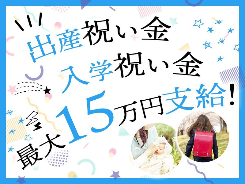 【保険制度】 雇用保険、労災保険、健康保険、厚生年金 待遇・福利厚生 【福利厚生】 ・交通費支給(月5万円いまで) ・自転車通勤・バイク通勤・車通勤OK ・週払いOK(木曜締め)最短で木曜勤務分を即払い可能 ・制服貸与 ・更衣室・休憩室完備 ・資格取得支援制度 ・転居費用補助制度 ・人間ドック補助(40歳以降) ・インフルエンザ予防接種補助(配偶者も補助可能/規定あり) ・出産祝い金制度 最大15万円 ・お子さんの入学祝い金制度 最大15万円(小学校・中学校・高校の入学でそれぞれ支給) ・社員紹介制度 ・コミュニケーションサポート制度(社員同士の懇談会に対しての補助/1人あたり5,000円)