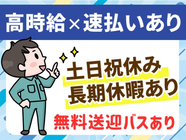 仕事内容 <9/1スタート!> 高時給×交替勤務で稼げる! 無料送迎バスありで通勤もラクラク! 20代・30代・40代男性活躍中! 「おすすめポイント」 ・土日祝休み ・高時給1,400円 ・未経験OK ・無料送迎バスあり ・速払いサービス制度あり ・髪色自由 【機械オペレーターの仕事内容】 自動車電装関係に使用される部品の 製造・検査・梱包業務をお願いします。 ~取り扱う部品~ ミニチュアシグナルリレーと呼ばれる、 電気信号の受け渡しを行う部品 <機械オペレーター> ①リレーの外側の部分の成型 ・材料投入 ・金型交換 ・機械のエラー時の対応 ・機械のメンテナンス ・機械の清掃 ②リレー本体の製造 ・部材投入 ・金型交換 ・機械のエラー時対応 ・機械のメンテナンス ・機械の清掃 ※組立工程1名、部品工程1名の マシンオペレーターが担当する予定です ①②両工程とも、基本複数台の成形機を確認し、 問題があった際の対応がメインになります。 組立などは機械がすべて行うので、 難しい作業・細かい作業などはございません。 PCを使っての簡単な数値入力作業もございます。 <検査> 完成した部品にキズがないか、 機能などに不備がないかを確認し、 良品と不良品に分ける。 <梱包> 部品を箱に詰め、出荷準備 【職場環境】 ・クリーンルームでの作業 ・簡易的なクリーンスーツ着用(上下に分かれているもの) ・騒音区分2の工程も含まれるため耳栓支給 ・暑い、寒いは無い快適な環境 【高時給で稼げる】 高時給1,400円! 交替勤務なので深夜割増もあり(1,750円)! ガッツリ稼げます! 【土日祝休み】 プライベート充実の土日祝休み! GW・夏季・お盆・年末年始休暇などの 長期休暇もございます! 帰省や旅行もできますよ! 【勤務地について】 白石市の工場 ・白石蔵王駅から車で3分 ・車、バイク、自転車通勤OK ・交通費支給※規定あり 【未経験OK】 製造業経験がない方もOK! 業務をしっかり習得できるまで 先輩スタッフが丁寧に指導します! 【経験も活かる】 機械オペレーターや検査業務などの 製造業経験、工場勤務経験がある方は 即戦力として活躍できます! 【幅広い年代活躍中】 20代・30代・40代の男性が多数活躍中! 経験豊富な50代のスタッフも在籍! 製造業に興味がある方、 製造経験を活かしたい方、ぜひご応募ください。 まずはお気軽にお問い合わせください。