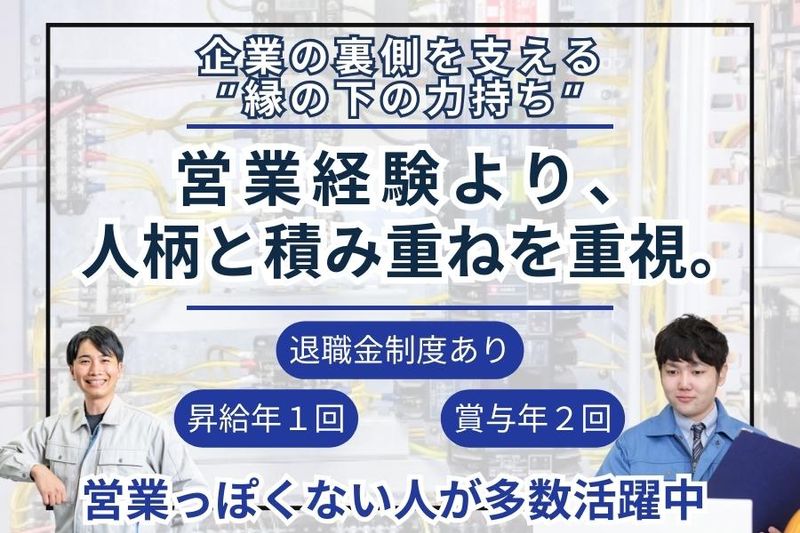 求めている人材 【必須条件】 ・普通自動車運転免許(AT限定可) 【歓迎する経験・スキル】 ・法人営業の経験(業界不問) ・メーカー営業/技術営業の経験 ・接客・販売など対人業務の経験 ・工場設備/製造業に関わった経験 ※営業未経験の方も歓迎します。 ◆未経験歓迎 ◆第二新卒歓迎 ◆業界未経験OK ◆営業未経験OK ◆学歴不問 ◆他業種からの転職歓迎 ◆キャリアチェンジ歓迎 ◆長期キャリア形成を目指す方歓迎 ✅こんな方お待ちしてます!  ̄ ̄ ̄ ̄ ̄ ̄ ̄ ̄ ̄ ̄ ̄ ̄ ̄ ̄ ̄ ̄ ̄ ̄ ̄ ̄ ・まじめにコツコツ努力できる方 ・素直に学び、成長し続けられる方 ・新規開拓にも前向きに挑戦できる方 ・エンジニア相手の提案営業に挑戦したい方 ・すぐに成果が出なくても、粘り強く取り組める方 ・会社や仲間を大切にできる方 当社の営業は、派手さよりも “積み重ね”を大切にする仕事です。 知識や経験は入社後に身につきます。 大切なのは、誠実に取り組む姿勢と成長意欲。 売上や結果だけでなく、 長く信頼を築いていける方を歓迎します。