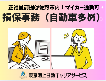 仕事の内容 \昭和26年の創業の安定企業/ ◆引継ぎは年末までにシッカリあります○ ◆基本17時半定時で退勤 ◆勤務地は佐野市内!マイカー通勤可 【基本情報】 雇用形態:派遣社員 雇用期間:長期(3カ月以上) └3月~開始日相談可能 就業時間:8:30~17:30(休憩60分) 【必須条件】 ◆損保事務のご経験がある方 ◆パソコン:基本操作(入力~修正) 【お仕事内容】 ・見積書・申込書作成 ・更新、異動、解約、計上 ・照会応答 ・精算 ・事故受付 など ※種目:自動車、火災、傷害 ※取り扱い保険会社:東京海上日動 ◆ヤリガイ◎ゆくゆくはひとり体制で事務をお任せ予定☆彡 ◆時々、車で外出の依頼あり! 【環境面等】 ・30代・40代・50代の多い職場 └幅広い年代活躍中/子育てに理解ある主婦・主夫活躍中 ・ランチタイムは休憩スペース利用OK └お弁当持参OKです ・オフィスカジュアル内で服装自由 【福利厚生等】 ・社会保険完備 ・車通勤OK(駐車場あり) ・禁煙オフィス!煙苦手な方も安心 ・基本平日のみOK!土日休み ・年間休日110日以上&お休み相談可 └週休二日制(土日)、有給休暇、年末年始 ~家庭やプライベートとの両立も◎ご経験を活かして、もう一度“自分らしい働き方”を始めてみませんか? 少しでも気になった方は、ぜひお気軽にご応募ください♪~ ○●嬉しいPOINTたくさん!●○ 正社員前提/紹介予定派遣/転勤なし/U・Iターン歓迎/賞与あり/昇給あり/福利厚生充実/退職金あり/開始日相談/主婦・主夫活躍中/子育てに理解のある職場/損保ブランクOK!社員に相談できる環境/社会保険完備/残業月5時間以内!ほぼ17時半で退社/8時間以内勤務/交通費全額支給/残業代全額支給