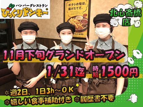 仕事内容 \\ オープニング大募集!! // ■━■━■━■━■━■━■━■━■ 11月21日、心斎橋エリアに 「びっくりドンキー」がNEW OPEN! 初バイト・未経験も大歓迎! オープン時給1500円!! (11/21~1/31の間) ■━■━■━■━■━■━■━■━■ 【 アピールポイント★ 】  ̄ ̄ ̄ ̄ ̄ ̄ ̄ ̄ ̄ ̄ ̄ ̄ □オープニングだから一斉スタート! □オープニング特別時給1500円!!(1月31日まで) □美味しい食事補助あり! □賑やかでサークルみたいな楽しいバイト!! □履歴書不要! ■お仕事内容  ̄ ̄ ̄ ̄ ̄ ̄ ̄ ̄ ・簡単な調理補助 ・出来上がった料理の盛り付け ・皿洗い など まずはお皿洗いや簡単なサラダの盛り付け等から! 慣れてきたら、ハンバーグを焼いたり サイドの作成をお任せ! 少しずつ業務に慣れていけばOKです♪ ■嬉しい食事補助あり!人気のハンバーグが50%オフに♪  ̄ ̄ ̄ ̄ ̄ ̄ ̄ ̄ ̄ ̄ ̄ ̄ ̄ ̄ ̄ ̄ ̄ ̄ ̄ ̄ ̄ ̄ ̄ ̄ ̄ ̄ ̄ びっくりドンキーで働くと… なんと、人気メニューが50%オフで食べられます★ ハンバーグ好きにはたまらない特典! 「仕事終わりにあのハンバーグ…♪」 「ランチでお得に食べられるのが嬉しい!」 そんな声がスタッフからも多数! おいしいごはんでお腹も心も満たされますよ♪ ■シフト融通バツグン!  ̄ ̄ ̄ ̄ ̄ ̄ ̄ ̄ ̄ ̄ ̄ ̄ 週2日~、1日3時間~OK!! 短時間もフルタイムももちろん大歓迎! 自分の働きやすい時間帯に勤務できます◎ ▼ 初バイトさんも安心♪ 高校生・大学生・専門学生さんなど、 同年代の仲間がたくさん! ほとんどのスタッフが未経験スタートだから、 「バイトって緊張する…」って人も心配ナシ◎ みんなでゼロからお店を作るから、毎日がちょっとワクワク★ ▼ 主婦(夫)さんの味方です! 「お昼だけ」「平日のみ」も大歓迎! お子さんの体調不良や学校行事にも柔軟対応♪ 家族との時間も大切にしながら働けます◎ ▼ Wワーク派のフリーターさんにも◎ 週1回のシフト提出だから、スケジュール管理もラクラク♪ 「今週は他のバイトが忙しい…」ってときも安心! ムリなく、自分のペースで働けます! ■履歴書不要で面接OK!  ̄ ̄ ̄ ̄ ̄ ̄ ̄ ̄ ̄ ̄ ̄ ̄ ̄ はじめてのお仕事で不安な方も、 久しぶりのお仕事復帰の方も、 気になることはなんでも聞いてくださいね! 職場環境やどんな働き方なのか 待遇の詳細など、すべてお教えします! 安心してお仕事をスタートできるよう 全力でサポートいたします! あなたの人柄をぜひ知りたいので、 まずは面接でお話ししましょう!