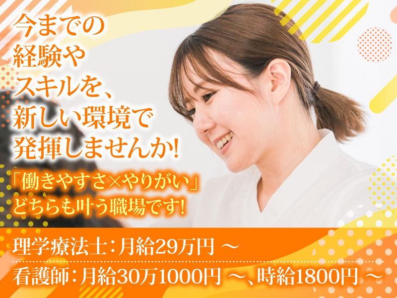 求めている人材 ◎オープニング大募集! ◎要理学療法士資格 ◎PCでの入力が出来る方 ◎ブランクOK! ◎明るく元気に対応できる方 ◎子育てが落ち着いて久しぶりに働きたい方 ◎子育て中の方もお気軽に! ======================= <こんな方は歓迎!> 心臓リハビリテーション指導士(資格手当・給与加算を検討) ======================= <こんな方にピッタリ!> ・患者さんとの対話を大切にし、継続できるリハを一緒に作っていける方 ・新規開院の立ち上げを前向きに楽しめる方 ・チームで協力し、落ち着いて丁寧に業務に取り組める方