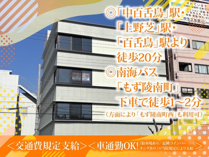 交通・アクセス ◎「中百舌鳥」駅・「上野芝」駅・「百舌鳥」駅より徒歩20分 ◎南海バス「もず陵南町」下車で徒歩1〜2分(方面により「もず陵南町西」も利用可) ◎車通勤OK!(駐車場あり/近隣コインパーキングあり)※当院規定により支給