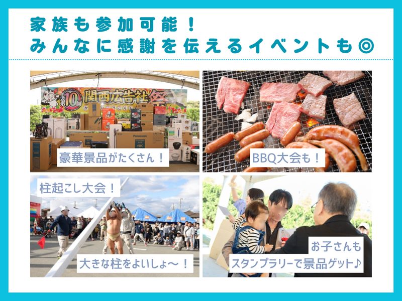 仕事内容 \まっさらなスタート、一緒に楽しもう!/ オープニングだからこそ、 未経験でものびのび挑戦できます♪ ⭐基本は土日祝休み ⭐年に3回の長期休暇(各8~9連休) ⭐定時で「おつかれさん」が当たり前! ⭐直行直帰OKで自分のペースで働ける ⭐人と話すのが好きならOK! ⭐頑張りはインセンティブで還元♪ 地域のお店やクリニックなどを応援する 「屋外広告」のご提案営業です! 「人と話すのが好き」 「誰かの役に立ちたい」 という気持ちがあれば大丈夫。 入社後は先輩がしっかりとサポートするので、 営業職が初めての方も安心です✨ また、お休みしっかり+残業ほぼなしで、 仕事と家庭の両立も◎ 子育て中のパパさん・ママさんも大活躍! 直行直帰OKなので、 スケジュールも自分のペースで調整できます。 ■当社の魅力をお伝えっ! ┈┈┈┈┈┈┈┈┈┈┈┈┈┈┈┈•• ✅定時で「おつかれさん!」が当たり前 「家族とごはん」 「ジムでリフレッシュ」…など、 18時にはほとんどの社員が退勤しています! 月給には【22時間分/30,900円】の 固定残業代が含まれていますが、 実際の残業はほとんどなし! パパ世代からも 「家庭との両立がしやすい!」と好評です◎ ✅しっかり休める=しっかり働ける ・基本は土日祝休み ・年に3回、8〜9連休の長期休暇あり! ・スケジュールは自分で調整OK◎ 家族旅行や帰省、趣味の時間… しっかり休んでリフレッシュできるから、 仕事へのモチベーションも自然と上がります! ✅ずっと奈良で、腰を据えて働ける安心感 関西広告社は「転勤なし」! 今いる場所で、家族との暮らしを大切にしながら、 長く安心して働ける環境を整えています。 「転勤で子どもの学校が変わるかも…」 「親の介護があるから、地元を離れられない…」 そんな不安とは無縁です◎ 地域のお客様とじっくり信頼関係を築きながら、 あなたらしいペースで営業を続けていけます! ✅選べる給与スタイルで、あなたらしく 固定給+インセンティブ、 または歩合重視のスタイルなど 2つの給与パターンから選択可能! 入社後の試用期間を経て、 希望に応じて変更もOK。 頑張り次第で年収1000万円も目指せますが、 “ほどよく稼ぎたい派”の方にも フィットする柔軟さが魅力です♪ ✅若手の一歩を応援!奨学金返済支援あり 月1万円の「奨学金返済手当」を支給(規定あり)✨ 「学生時代、一生懸命に学んだ若手が 安心して働けるように…」 という想いから生まれた制度です。 経済的不安を減らして、 仕事に集中できる環境へ◎ ✅面白すぎる!?ちょっとユニークな福利厚生 「こんな制度あるの!?」と社員も驚く、 ちょっと変わった福利厚生も◎ ・無農薬野菜の定期支給 ・家族も参加OKのBBQイベント ・誕生日のお祝い制度 など “人を大切にする社風”を、 福利厚生からも実感できます♪ より細かな詳細は〈福利厚生〉の部分へ! ■お仕事内容 ┈┈┈┈┈┈┈┈┈┈┈┈┈┈┈┈•• \今回はオープニングスタッフ募集!/ スタートはみんな一緒。 未経験の方も安心してチャレンジできます♪ 「お客さんにもっとお店の場所を知ってほしい」 「開院したことを地域の人に伝えたい」 ──そんなお悩みをもつ企業・お店に向けて、 “屋外広告(看板)”をご提案する営業のお仕事です! 営業といっても「売り込む」というよりは、 お客様のお話を聞いて、 ぴったりの場所やサイズ、 デザインを一緒に考えるスタイル◎ 地域のクリニック・飲食店・美容室・商業施設など、 さまざまなお客様を「看板」で支える、 やりがいのあるお仕事です! ▼具体的には… ─────── 提案先は、新規と既存の両方◎ 「看板を使って、もっと人に知ってもらいたい」 という企業様に向けて、 下記のお仕事をお任せします! ✅ お店や企業への広告・看板のご提案 ✅ 設置に最適な場所の調査・企画 ✅ 土地のオーナー様とのやりとり ✅ スケジュール管理やメール・電話対応 など ▼安心のサポート体制 ───────────── 今回はオープニング募集なので、 「いきなり現場にポン!」なんてことはありません。 未経験の方でも安心してスタートできるように… ✨ロールプレイング研修 ✨営業同行(ペアで現場に行く) ✨じっくり育てる育成制度あり 先輩たちと一緒に 「どんな提案がいいかな?」を考えるところから、 あなたのペースでスタートできます◎ ▼別業種からのチャレンジも大歓迎♪ ───────────────── 「営業って未経験だけど、大丈夫かな…」 「子育てが落ち着いたから、 そろそろ仕事復帰したい」 「人と話すのは好きだから、やってみたい」 ──そんな想いを持つ方、大歓迎です◎ ☑ 普通免許(AT限定OK) ☑ パソコンの基本操作ができる この2つができれば、応募資格はバッチリ! 知識ゼロ・未経験からスタートした先輩もたくさんいます♪ もちろん、 「以前、広告の営業をやっていた」 「法人営業の経験がある」 という方は、しっかり優遇いたします◎ これまでの経験に自信がある方も、 これから経験