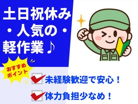 仕事内容 \ここがポイント/ ★未経験OK!マニュアル完備で安心スタート◎ ★土日祝休みで家庭との両立もばっちり♪ ★月収20万円以上も可能な安定収入! ★軽量製品だから体への負担も少なめ! *・。・。*・。・。*・。・。* <仕事内容> 工場で製造されたアルミ製品の検査・清掃作業をお任せします。 ・マニュアルに沿って、製品の目視チェック ・簡単な調整や仕上げ作業 ・埃取りや拭き取りなどの軽い清掃作業 *就業後の業務内容変更なしで安心 *・。・。*・。・。*・。・。*