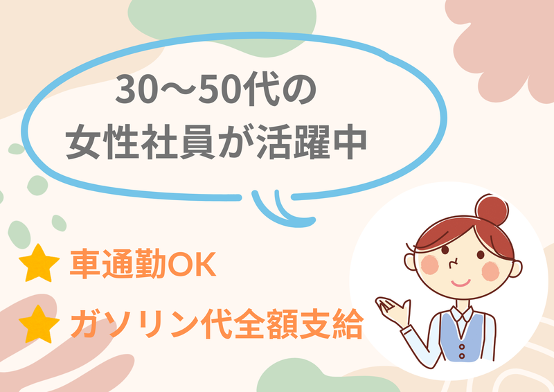 求めている人材 <女性活躍中!> 普通自動車免許又は 原付(バイク)免許※通勤用 未経験者歓迎 無資格歓迎 主夫・主婦歓迎 経験者歓迎 学歴不問 ブランクOK 経験不問 30代・40代・50代の方も活躍中