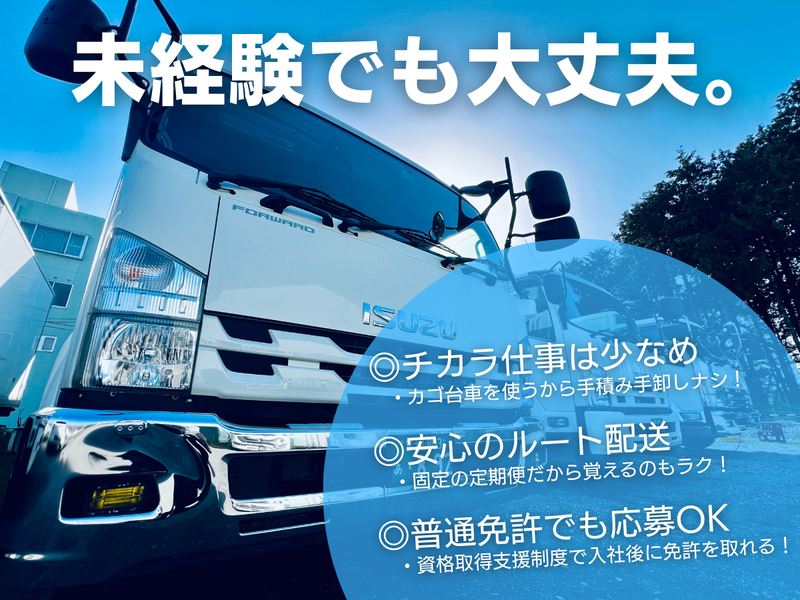 仕事内容 ===⭐ アピールポイント ⭐=== ✅月給31万円スタートの高収入! ✅カゴ台車利用で力仕事ほぼなし ✅対面接客なし!1人で気楽に配送 ✅髪型・髪色自由髭もOK! ✅有給消化率約96%!連休取得も可 ================== 【業務内容】 4tトラックでのスーパーや ドラッグストアへのルート配送をお任せします。 配送先は無人店舗が中心で、 商品はカゴ台車を使って積み下ろしするため、 体への負担も少なく安心です。 実際に女性ドライバーも多数活躍中です。 ▼ 具体的なお仕事 ▼ ・配送エリア:スーパーやドラッグストアへのルート配送 ・積み込み:物流センターでのカゴ台車の積み込み ・配送件数:1日2~3便、1便につき1~2店舗へ納品 ・荷下ろし:パワーゲートを使用したカゴ台車の納品 ・車両点検:配送車の日常点検・管理 <経験ゼロでもこれで安心> 1.普通免許(AT限定)だけで応募OK! 2.中型免許は会社の支援制度で入社後に取得可能 3.同乗研修でルートや作業手順を丁寧にレクチャー <当社で働く魅力> 1.「自分らしさを大切にできる環境」 →髪型・髪色自由、髭OK、制服ありですがトラックのカスタムも規定内でOK。個性を活かして働けます。 2.「対人ストレスフリーな働き方」 →夜間の無人店舗への納品が中心なので、接客は一切なし。1人の時間を大切に黙々と作業に集中できます。 3.「プライベートも充実の休暇制度」 →有給消化率は約96%と高水準。希望すれば年1回最大9連休の取得も可能で、旅行や趣味も楽しめます。 <入社後の流れ> 入社後は資格取得支援を活用して中型・大型免許を取得し、 ドライバーとしての専門スキルを着実に高められます。 将来的には運行管理者へのキャリアチェンジや、 大型配送でさらに収入アップを目指すことも可能。 安定企業の中心メンバーとして長く活躍できる環境です。 <<<先輩インタビュー>>> 「トラックの仕事って大変そう…正直、最初は不安でした」 そう話すのは、入社1年目の先輩ドライバー。 前職は接客業で、運送業はまったくの未経験。 でも、今では毎日4tトラックで食品を配送し、しっかり活躍しています。