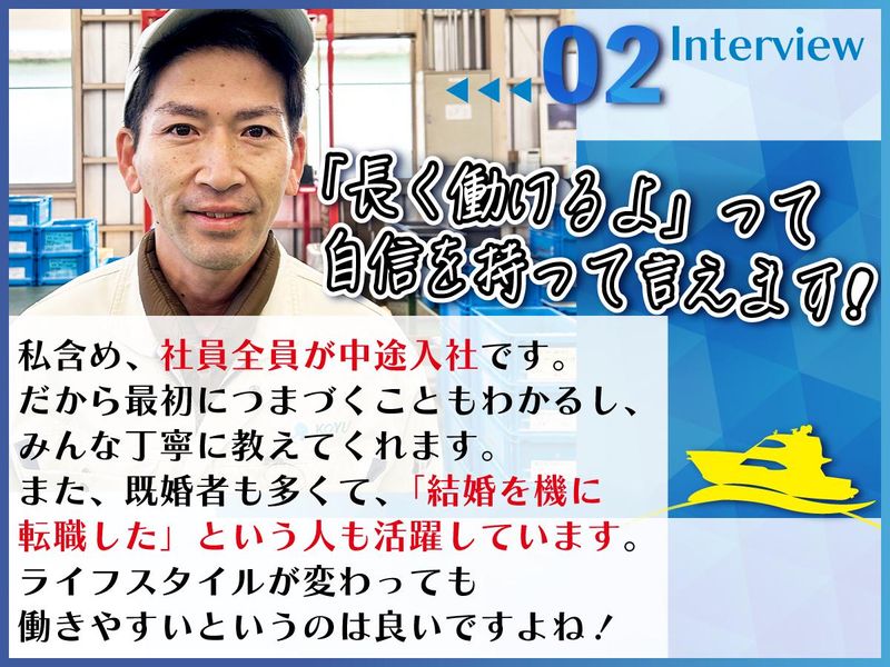 職場環境 \仲間の人柄・職場の雰囲気抜群/ 20~30代の若手活躍中! *直近23歳男性が入社 10年以上活躍する社員、 勤続23年のベテラン社員も在籍! <既婚者・パパ活躍中> 社員の70%以上が既婚者! 子どもの学校行事など、 家庭と両立しながら働いています!