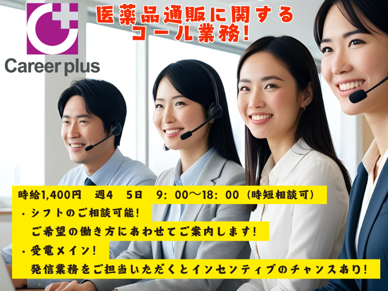 仕事内容 「50代、60代でも活躍できるお仕事を探している!」 「家事や育児と両立しながら働きたい」 「人と話すのが好き」 「働く環境を変えたい!」 「コールセンター経験を活かしたい!」 そんな方にピッタリのお仕事です! 50代~60代が腰を据えて活躍中◎ もちろん20~40代の若手の方も大歓迎! 丁寧な研修とサポート体制が整っているので、 未経験の方も安心です。 ------------------- 健康食品や化粧品などを取り扱う 通販コールセンターで、お電話の対応を お願いします。 【主な業務内容】 ■ 受信対応(メイン) ・商品の注文受付(新規・定期) ・お届け日や住所の変更受付 ・解約・コース変更の受付 ※しっかりとした研修があるので、未経験でも安心◎ ■ 発信業務(慣れてきたら) ・ご購入後のお客様へのフォローコール ・キャンペーンや再購入のご案内 ※発信業務ではインセンティブ制度あり! (月上限3万円) 商品知識は入社後の研修でしっかり学べます。 お話好きな方・人の役に立つ仕事がしたい方にはピッタリです! 【おすすめポイント】 ・週4〜OK、時短勤務や平日のみ勤務も相談OK(週3日は要相談) ・インセンティブ制度あり(上限3万円/月) ・服装・髪色・ネイル自由!おしゃれも楽しめる♪ 【就業先企業について】 株式会社キャリアプラス <事業内容> ヒューマンリソーシズ事業、BPO受託運営サービス事業他 ~~~~~~~~~~~~~ \興味がある・気になる⇒お問合せください/ ・丁寧な研修があるので経験も知識も必要ナシ☆ しっかり不安を解消してスタートできます! 学業/趣味/育児・子育て/介護との「両立」の強い味方! Wワークとの両立や、家事や趣味の時間を確保したいなど、応援します!! 飲食店や接客販売・営業・受付・電話対応、などからの転職者が活躍中! ご条件に合わない場合は、別のお仕事の紹介もOK! ~~~~~~~~~~~~~