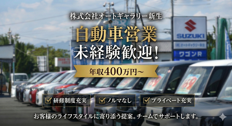 仕事内容 【正社員/オープンポジション】「自分に合う仕事」をここから見つけよう。 「車の知識はないけど、人と関わる仕事がしたい」 「稼ぎたい気持ちはあるけど、自分に何ができるか分からない」 そんな悩みをお持ちの方こそ、ぜひ当社に来てください。 今回は職種を限定しない【オープンポジション】での募集です。 「バリバリ稼ぐプレイヤー」か、「お客様を支えるサポーター」か。 面接であなたの人柄や希望をお伺いし、一番輝けるポジションを会社と一緒に決めていきましょう! 職種:総合職(適性に応じて配属を決定) 入社後、あなたの適性や希望の働き方を考慮して、以下のいずれかの業務をお任せします。 【1】アクティブに稼ぎたいなら…(提案・販売) 役割: ご来店されたお客様へ、ライフスタイルに合う一台をご提案します。 魅力: 頑張りがダイレクトに給与に反映。「年収400〜500万円以上」を早期に実現したい方に最適です。 【2】じっくりサポートしたいなら…(受付・案内) 役割: 車検や点検の受付、プランのご案内、整備士との連携など、お客様と現場の橋渡し役です。 魅力: 残業は月20時間以下と少なめ。お客様からの「ありがとう」が嬉しい、安定して働けるポジションです。 アピールポイント ✅ 未経験スタート率ほぼ100%! 先輩社員のほとんどが異業種からの転職組。 →特別な知識は入社後の研修で覚えればOKですので、現在のスキルは問いません。 ✅ 20代・30代が中心のフラットな職場 「売るテクニック」よりも「お客様への寄り添い」を評価する社風。 →人間関係のストレスがなく、同世代の仲間と楽しく働けます。 ✅ プライベートも充実 →希望休も相談しやすく、ライブや旅行などプライベートの時間もしっかり確保できます。