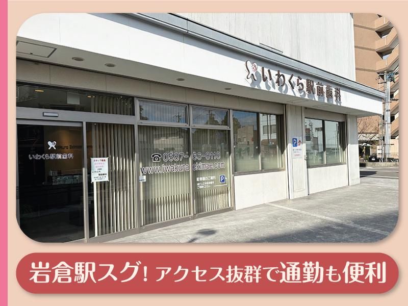 仕事内容 1日通しOK!午後のみOK! 夕方~ラストまでOK! / 柔軟に働ける環境だから、 学業や家事との両立もバッチリ! \ *無資格・未経験歓迎 *時間帯や曜日の相談OK *ほぼ残業なし *岩倉駅~徒歩1分 *女性活躍中 ―――――――――――――――――― お仕事について。・* ―――――――――――――――――― いわくら駅前歯科は、小さなお子様から ご年配の方まで、様々な患者様が ご来院される歯科医院です。 そんな当院で、受付・助手として 下記業務を行っていただきます。 【業務内容】 ・患者様対応 ・予約管理 ・お会計 ・歯科衛生士の補助 ・器具の準備・片付け ・診察サポート など 業務のことはイチから丁寧に お教えするので未経験でも大丈夫! 安心して飛び込んできてくださいね! ―――――――――――――――――― 当院で働くメリット。・* ―――――――――――――――――― \ プライベートと両立できる / 働きやすい環境づくりには余念なし! 3年前には、受付時間を18:30までとし、 診療時間を短縮したこともあります。 残業も月2~3h程度とかなり少なめ! さらに、「午後のみ」「1日通し」 「夕方~ラストまで」など、 都合に合わせて働けるので 学業や家事との両立にも最適です。 \ ステキな院長がいる / 院長の犬飼は、診療技術の高さは もちろん、患者様やスタッフのことを 大切にする姿勢も評判です。例えば、 「スキルアップがしたい」と相談すれば、 講習会を手配してくれるなど スタッフの想いを尊重してくれます。 \ あたたかい仲間がいる / 現在、歯科医師3名、衛生士3名、 助手4名が在籍中。 ステキな院長のもとに集まった 仲間たちだから、優しい人ばかり! わからないこと・困ったことも 聞きやすい環境ですよ!