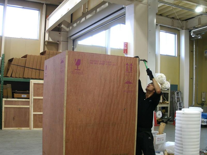 精密機械製品の木箱梱包スタッフ