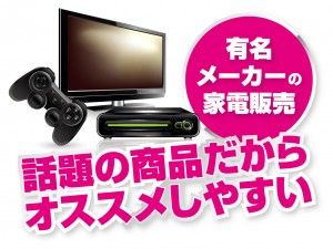 仕事内容 大手国内家電メーカーテレビ、テレビ関係周辺機器の販売スタッフ◎ 働きながら最新のテクノロジーに触れられるお仕事 家電量販店にて、商品の説明と販売のお仕事です! 担当の商品はテレビ等です。 大手国内人気メーカーの商品なので、お勧めもしやすいです♪ 最新機器のおススメや取扱いなどの説明と販売(*^_^*) 接客販売などの経験をお持ちの方にもピッタリのお仕事! 自然と家電製品に詳しくなれます。 一緒に魅力ある楽しい売り場作りをして下さる方! お待ちしております!(^^)! *家電製品に興味のある方! *20~50代の男女活躍中です! ご応募、お待ちしております☆ [厳しさ] 接客を楽しむことが出来れば厳しい事はありません [こんな人が活躍] 20代~50代の方が活躍中! 未経験でも、お客様応対が出来れば大丈夫です