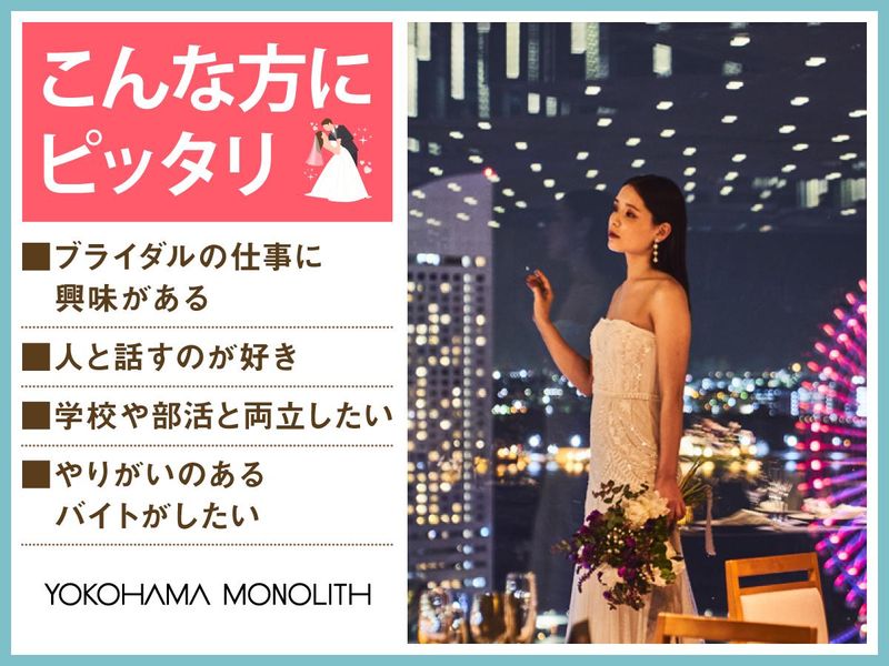仕事内容 *みなとみらいを一望できる結婚式場* 感動いっぱいの結婚式を一緒にサポート♪ 週1~の柔軟シフトでWワーク・副業OK! フリーター・学生・主婦パートも活躍中♪ 横浜モノリスは みなとみらいの景色を一望できる オーシャンビューの結婚式場。 ウェディングのお手伝いをするお仕事です◎ <主なお仕事内容は…> ■食器/カトラリーの洗浄、片付け ■簡単な盛り付け補助 ■食材の下処理(野菜カットなど) ■調理器具、キッチン内の清掃 ■シェフや調理スタッフのサポート業務 ★包丁を使った本格調理はなし! ★分業制なので未経験の方も安心です! 一流シェフの技を学べるチャンス! ―――――――――――――――― フリーター・パート主婦・学生さん オススメのポイントはこちら★★ ―――――――――――――――― 📌週1日~1日4時間~OKで融通◎ 📌本業が休みの土日だけ等大歓迎! 📌かけもち・副業OK! 📌絶品のまかないアリ(^^) まかないは本格料理人たちが 美味しい食材を使って作ってくれます♪♪ 現在はアルバイト・パート8名が活躍しています! 学生4名、主婦3名、フリーター1名が在籍中! ブライダル=女性と思われがちですが、 性別問わず活躍できます! 男女ともに活躍中です! ―――――――――――――――――― こんな方にピッタリです! ―――――――――――――――――― ■モクモクと作業するのが好きな方 ■裏方の仕事に興味がある方 ■接客は少なめがいい方 ■ブライダルやレストランに興味がある方 洋菓子店、レストラン、ホテル、結婚式場、カフェなど、 経験がある方は活かしていただけます★ もちろん未経験でもOK! ―――――――――――――――― 未経験者歓迎! みんなで助け合う雰囲気です ―――――――――――――――― 「働くこと自体久しぶり…」 そんな方もご安心ください。 不安がなくなるまで、 スタッフ全員でサポートします◎