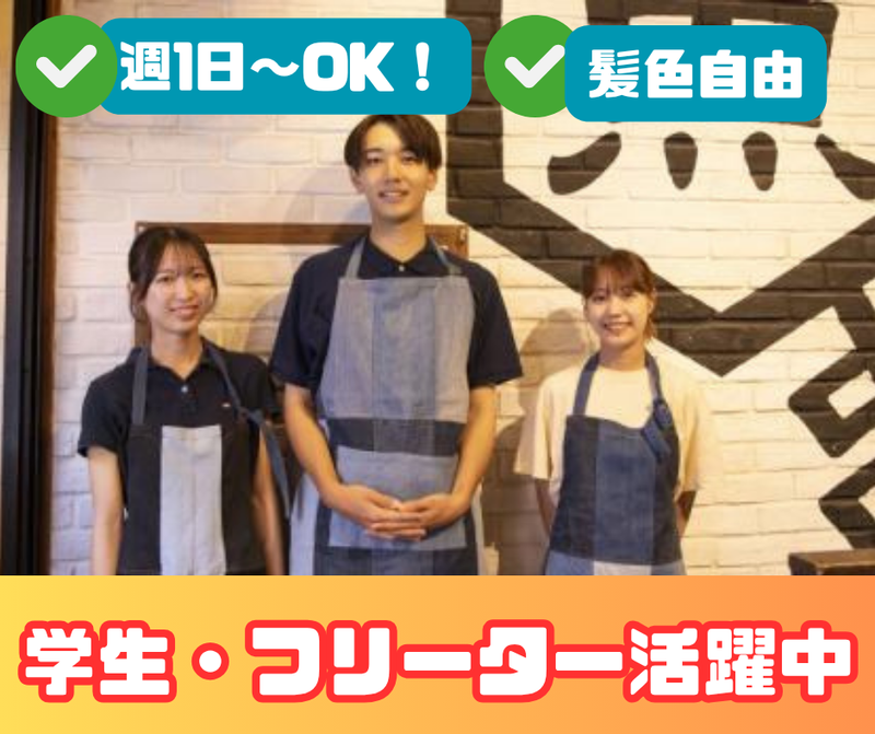求めている人材 ✅接客未経験もOK ∟飲食店でのバイト経験がある方は優遇します ⭐学生・フリーターさん多数活躍中! ⏩以下の方、大歓迎♪ ・人と話すことが好きで、笑顔で接客できる方 ・チームワークを大切にし、仲間と協力して働ける方 ・飲食や料理に興味があり、学びながらスキルを身につけたい方 ・未経験でもチャレンジしてみたい方(丁寧にサポートします!) \こんな方にもピッタリです♪/ ・「飲食の仕事に興味がある」 ・「仲間と楽しく働きたい」 ・「経験を活かしてさらに成長したい」 そんな思いを持つ方に最適な職場です ⏩活躍しているスタッフさんは… ・学生さん:学校やサークルと両立しながら活躍中! ・フリーターさん:レギュラー勤務でしっかり稼ぎたい方も大歓迎!