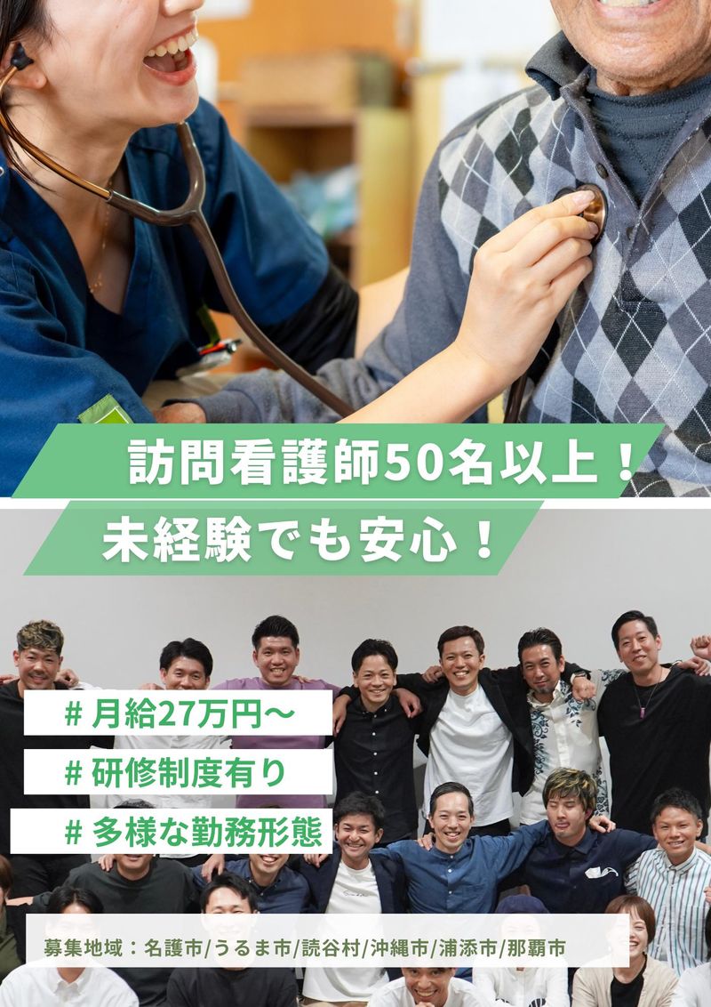 仕事内容 【看護師説明会開催】 入社前に会社のことをもっと詳しく知りたい! 具体的な勤務内容や勤条件を知りたい! という方を対象に看護師説明会を開催します ================ 【日程】 4月23日(木) 場所:クラセル浦添(浦添市伊祖2-21-18 イオンドラッグストア2階) 時間:19:00~ 4月26日(日) 場所:クラセル登川(沖縄市登川695-1) 時間:11:30~ 4月29日(水) 場所:クラセル小禄(那覇市小禄1-1-12) 時間:11:00~ ================ 【仕事内容】 ◆正看護師58名在籍の安心体制◎ ◆オンコール月4-6回・出動率20% ◆特定行為研修を全額・一部補助あり ◆髪型・ネイル自由で自分らしく♪ ✅仕事内容  ̄ ̄ ̄ ̄ ̄ ̄ ̄ ̄ ̄ ̄ ̄ ̄ ̄ ̄ ̄ ̄ ̄ 小児から高齢の利用者様まで、 幅広い年齢層の方々に対応できる職場です。 1日あたり4名から6名の方に対して、 30分~最大で90分程度の介入を行います。 病院や施設と比較すると、 利用者様の暮らしにじっくり関わることができます。 ⏩具体的な仕事内容 ■配薬、服薬調整、健康管理 ■点滴、ストマ管理、留置カテーテルの交換 ■皮膚状態の観察及び褥瘡の処置 ■家族への吸引/経管栄養手技の指導 ■お看取り対応 など ⏩未経験の方でも安心の研修体制 人工呼吸器の扱い方や 留置カテーテル交換は、 未経験の方でも安心して処置ができるように 随時、勉強会や同行訪問を行います。 入社後は同行訪問や精神科訪問看護研修、 特定行為研修制度などを整えています。 ✅平均1ヶ月で独り立ちできる研修制度  ̄ ̄ ̄ ̄ ̄ ̄ ̄ ̄ ̄ ̄ ̄ ̄ ̄ ̄ ̄ ̄ ̄ 入社後1〜2週目は先輩との同行訪問のみ。 手技の確認やアセスメントのコツを じっくり伝授します。 平均6ヶ月かけて、 自信を持って一人立ちできるよう サポートします。 悩みや不安は一緒に解決できる環境です。 ✅58名の正看護師が在籍する安心の職場  ̄ ̄ ̄ ̄ ̄ ̄ ̄ ̄ ̄ ̄ ̄ ̄ ̄ ̄ ̄ ̄ ̄ 従業員数:78名(2026年3月31日時点) 正看護師:51名 セラピスト:24名 平均年齢:39.2歳 男女比:約6:3 平均残業時間:5時間以内/月 ✅特定行為研修で専門性を高められる  ̄ ̄ ̄ ̄ ̄ ̄ ̄ ̄ ̄ ̄ ̄ ̄ ̄ ̄ ̄ ̄ ̄ 特定行為研修を全額・一部補助します。 資格取得後は店舗の「臨床推論のキーマン」 として活躍いただき、 役割に応じた手当や昇給で、あなたの 専門性を会社として正当に評価します。 ただ現場を回すだけで終わらない キャリアを描けます。 ✅オンコール負担が少ない安心体制  ̄ ̄ ̄ ̄ ̄ ̄ ̄ ̄ ̄ ̄ ̄ ̄ ̄ ̄ ̄ ̄ ̄ 訪問看護が初めての方が一番不安な 「オンコール」と「独り立ち」。 1店舗あたりの人数が多いため、 当番回数は月4-6回程度。 夜間の緊急出動確率はわずか20%程度です。 バックアップ体制も整っており、 迷ったらすぐに先輩に相談できます。 ✅髪型・ネイル自由で自分らしく働ける  ̄ ̄ ̄ ̄ ̄ ̄ ̄ ̄ ̄ ̄ ̄ ̄ ̄ ̄ ̄ ̄ ̄ 「看護師だからこうあるべき」という 固定観念は、クラセルにはありません。 清潔感があれば、 明るい髪色もトレンドのネイルもOK。 あなたらしいスタイルで 生き生きと働くことが、利用者様を 元気づける力になると信じています。 ✅当社について  ̄ ̄ ̄ ̄ ̄ ̄ ̄ ̄ ̄ ̄ ̄ ̄ ̄ ̄ ̄ ̄ ̄ 2026年3月時点で沖縄県内7店舗を運営。 ※5月には那覇市首里に開所予定。 訪問看護未経験でも安心して働けるように 定期的に会社説明会を開催しています。 会社説明会は、 面接担当が具体的な仕事内容や 勤務条件をご説明いたします。 説明会はスーツ着用、履歴書の持参も不要です。 自由な服装でお気軽に参加ください。 お問い合わせ先:(080-3152-4099 担当:川満) 会社ホームページ https://bestlife-okinawa.co.jp/