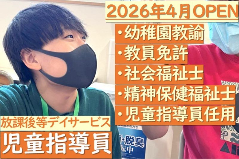 【アピールポイント】 2026年4月放課後等デイサービス新規OPEN! 「児童指導員」オープニングスタッフ募集! ●職場見学のみもOK ●新卒・第二新卒OK ●週休2日!日曜・祝日休み! ●長期休暇あり!