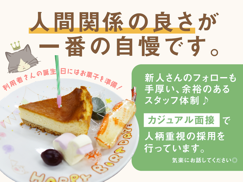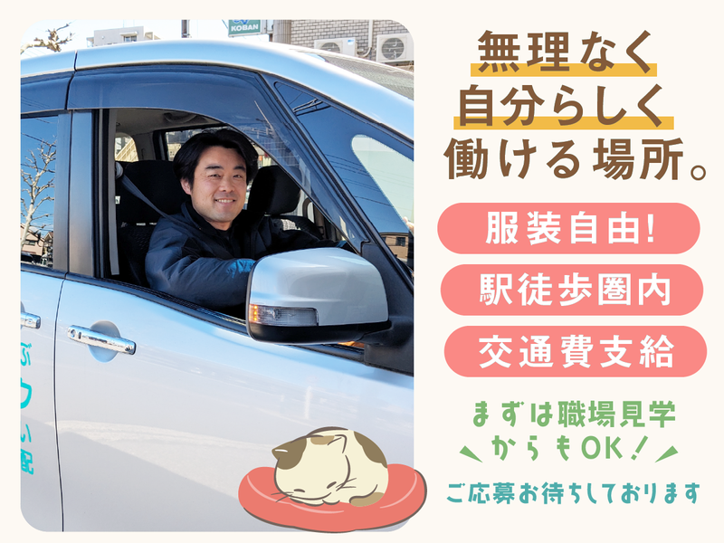 求めている人材 \30代~40代多数活躍中!/ ✨主婦(夫)さん歓迎✨ →障がいのあるお子さんがいる方も 安心して働ける環境を整えています。 【必須条件】 ・なし ⇒未経験歓迎・資格不問◎ ⇒ブランクもOK 【こんな方を歓迎します!】 ・福祉、教育業界がはじめての方 ・子どもと関わる仕事がしたい方 ・家庭や子育てと両立して働きたい方 ・Wワーク、扶養内で働きたい方 ・平日のみ、短時間で働きたい方 ⇒ライフスタイルに合わせた 働き方が可能です◎ 【こんな方におすすめ!】 ・アイデアを出すのが好きな方 ・意見を発信できる環境で働きたい方 ・一人ひとりに丁寧に関わりたい方 ⇒スタッフの「やってみたい」を 大切にする職場です!