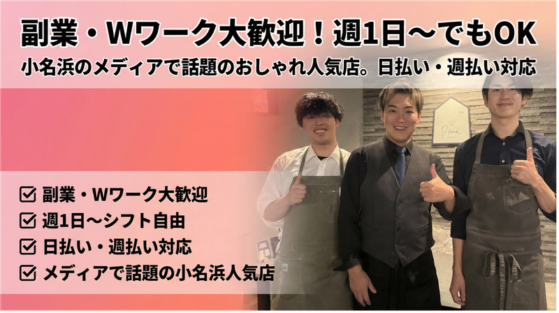 仕事内容 【アピールポイント】 ✅2026年3月NEWオープン! ✅某SNSで話題のお店の系列店! ✅日払い・週払いOK! ✅髪型・髪色自由 ✅1週間ごとのシフト提出! ✅好きな時間に勤務/好きな時間に帰宅OK! ✅未経験歓迎! ✅絶品まかない付き! ホール業務をお願い致します♪ 具体的には、 ・オーダー取り ・ドリンク作成/提供 ・フード提供 ・片付け/掃除 未経験でも丁寧にお教え致します♪ お気軽にご応募ください!