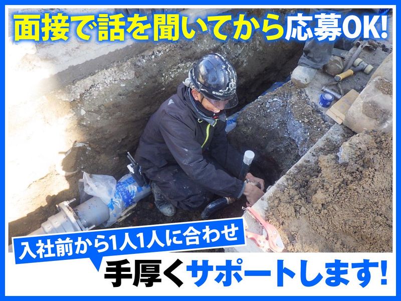 仕事内容 ★未経験から一生使える技術が身につく! ★あなたに合わせてじっくり&丁寧に育成! ★初年度年収396万円!修行中も安定収入! 水道管の取付・設置を行う当社で 工事を行う現場スタッフを募集! 現在発注量が増加しており、 今後も増えていくことが見込まれるので、 次世代育成のための増員募集を行います。 ==================== 全くの未経験から無理なく成長! 安定した働き方でじっくりスキルアップ! ==================== / 求人のココに注目!! \ ★頼れる先輩の丁寧な指導で着実に成長! ★残業少なめ!雨の日など早上がりの日も! ★修行中でも月給28万円以上!安定収入! ★賞与年2回&計2ヶ月分以上支給! ★資格取得支援制度で一生モノの資格GET! 「給水管って何?」という方でも 一人前の配管工になるまで 代表や先輩が1つずつ丁寧に教えます。 あなたが無理のない働き方で 技術磨きに集中できるよう 日給制ではなく“月給制”を採用。 安定した収入を稼げるうえ、 基本現場は15時くらいに終わるので 残業はほとんどなし。 現場によっては 勤務時間が変わることもありますが、 雨の日や作業ができない日は 昼過ぎに解散することも。 しっかり休みながら じっくり焦らず成長できる環境で 着実にスキルを身につけていきませんか。 - ◆仕事内容◆ - 水道工事をお任せします。 新築住宅や店舗、オフィスなど 建物内で水が使えるようにするために、 道路下の配水管と建物を繋ぐ 給水管の取り付け工事をお願いします。 ▼現場作業以外にも… 手掛ける工事は基本公共工事のため、 作業完了後は市や自治体への 「報告書類の作成」も大事な業務! 水道管設置後、現場の写真撮影や 提出用の書類作成等もお任せします。 ※現場は神戸市内が中心となります。 - ◆入社後の流れ◆ - まずは先輩と一緒に現場に行き、 工事で使う材料等の名前や使い方を 覚えることから始めます。 実際に先輩が作業する様子を見て あなたにも少しずつ触れていただき、 業務を覚えていきます。 →入社後3年ほどは1人現場なし! →業務に必要な資格は 働きながら取得可能! →独り立ち後は1人1現場で 自分のペースで黙々取り組めます。 - ◆安心の職場環境◆ - 現在、社長と 入社9年目の社員1名に加え、 未経験で入社し4年半ほどの社員2名、 計4名が配管工として活躍中! 仕事中は真剣そのものですが、 休憩や帰社後は和やかな雰囲気で おしゃべりできるほど仲の良さ◎ 忘年会や歓迎会なども行っており、 人間関係での悩むことはありません。 ==================== \\ 今の頑張りが将来を明るくする // ◎業務量安定!仕事がなくなる不安なし! ◎インフラを支える責任のある仕事! ◎自分で稼げる力が身につく!独立も可能! などと 将来まで安定して稼げるのが 当社で働く配管工の魅力! スキルを身につけてしまえば 一生生活に困ることなく 配管工として活躍し続けられます。 とはいえ、スキル習得に努力は必須。 水道管工事は覚えることが多く 1人で現場に行けるようになるまで約3年、 一人前と認められるまで約10年と 時間と努力が必要です。 そのため育成サポート充実! 失敗しても怒る先輩はいませんし、 あなたが安心して独り立ちできるまで 根気よく育てます。 “将来の自分を助ける技術”を身につけ 稼ぎもやりがいも安定性も 全部を掴み取ってみませんか。