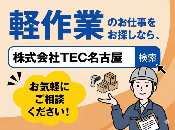 仕事内容 #土日祝休み #中川区からの送迎あり #残業ほとんどなし ================= 自動車に使われるコード類の 検査作業をお任せします。 ◎手のひらサイズの部品をチェックするだけ! ◎コードなので軽く、力仕事に自信がない方でも安心です。 ◎未経験歓迎!丁寧に教えるので、すぐに慣れていただけます。 ================= ▍TEC名古屋の特徴をご紹介 ▍ ★スタッフさんのフォロー♪  ̄ ̄V ̄ ̄ ̄ ̄ ̄ ̄ ̄ ̄ ̄ ̄ TEC名古屋では月に1回はスタッフさんに直接お会いして 皆さんのお仕事の悩みやもっとこうしたい! などの声をお伺いさせていただいています。 派遣が初めてで何から始めればいいか分からない方も、 派遣の経験はあるがどこでそれを活かすか悩んでいる人も 「皆さんの声」を大切にしていきます。 安心して任せて下さい! ★出張・即日面接可能!履歴書不要!  ̄ ̄V ̄ ̄ ̄ ̄ ̄ ̄ ̄ ̄ ̄ ̄ ̄ ̄ ̄ ̄ 出張面接や即日面接にも対応しています。 「忙しいけれども仕事の詳細はちゃんと聞きたい」 「時間が合わせられるか分からない」 そんな方ともきちんとお話が出来るように 対応させていただきます。 履歴書もなくても大丈夫! ご相談ベースでお気軽にご相談ください◎ ★名古屋で働きたいならTEC名古屋!  ̄ ̄V ̄ ̄ ̄ ̄ ̄ ̄ ̄ ̄ ̄ ̄ ̄ ̄ ̄ ̄ 名古屋市内を中心に多くの企業様と 接点を持たせてもらっています。 スタッフの方へご紹介できるお仕事も多数★ 「収入を増やしたい」「地元で働きたい」など あなたの希望を叶えるお手伝いが出来れば幸いです◎