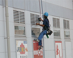 大空の下で建物の窓ガラスや外壁をお掃除!