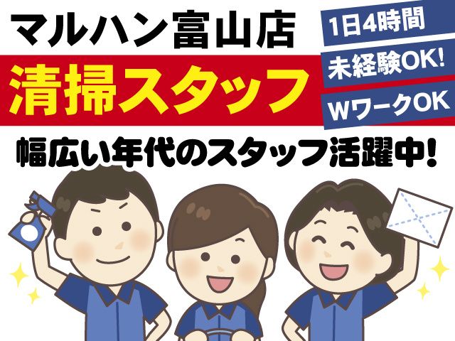 仕事内容 富山市田中町にある 「マルハン富山店」で 営業中の清掃スタッフを募集中 /////////////おすすめポイント///////////// 〇50代・60代多数活躍中! 〇ご都合の良い曜日で勤務OK! 〇平日のみ/土日のみもOK 〇1日4時間の短時間勤務! 〇主婦・中高年・シニアさん活躍中 〇簡易清掃で身体への負担が少ない! 〇Wワーク・副業(副収入)にも最適! 〇扶養範囲内勤務もOK ///////////////////////////////////////////////// だから… 無理なく長く続けられるお仕事です!! <お仕事内容> 施設内のゴミ・吸い殻の回収、トイレ清掃、 ホール内巡回清掃など作業です。 キレイな職場です。 ※難しい作業はありません。 未経験から活躍できる職場です! ※年齢不問で幅広い年代のスタッフ活躍中! ※短時間勤務ですので ご家庭との両立やWワークも可能です! モクモク作業するのが好きな方、 きれい好きな方にもおすすめです! - ご応募はWEBから24時間受付中! 面接1回! このくらい稼ぎたい、 この曜日に勤務したい、 平日のみ/土日祝のみなど ご相談やご質問も受け付けています!