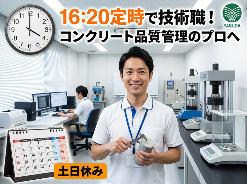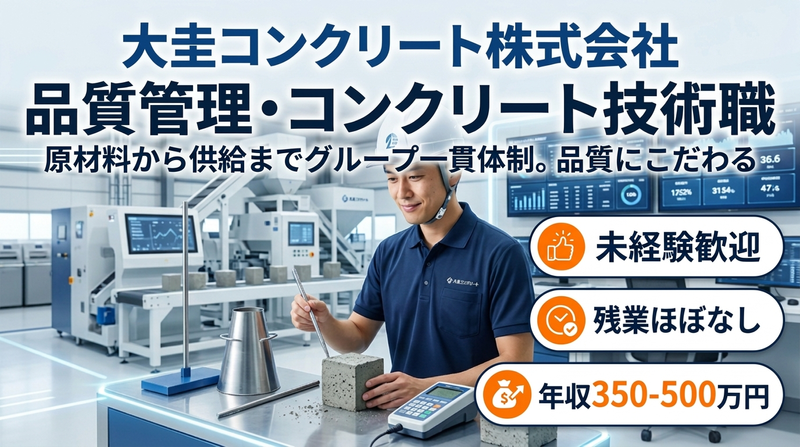仕事内容 \生コンクリートの品質試験・検査を行う技術職/ □建設現場での生コンクリートの品質試験 □採取サンプルの強度・空気量・粘度などの検査 □ゼネコン・自治体向けの試験報告書作成 建物の強度を左右する重要資材「コンクリート」の品質管理を担当します。専門資格を取得しながら、コンクリートのプロとして活躍できます。 ▼簡単な募集内容▼ 【雇用形態】正社員 【給与】年収:350万円~500万円 【勤務時間】8:00〜16:20 【勤務地】滋賀県近江八幡市千僧供町628-1 【募集要件】未経験歓迎◎学歴不問 ★この求人のアピールポイント★ ◇未経験からコンクリートの専門技術を習得可能! ◇残業ほぼなし!16:20退社でプライベート充実 ◇資格取得支援あり◎コンクリート技士を目指せる ◇転勤なし◎地元で安定して働ける ==================== 【どんな会社?】 大圭コンクリート株式会社は、滋賀県近江八幡市を中心に建設現場で使用される生コンクリートの製造・販売を行う会社です。 親会社は創業70年以上の老舗企業「安田組」で、砂利などコンクリート原材料の供給から施工までグループで担う強固なビジネスモデルを持っています。 生コンクリートは建物や道路などの建設に欠かせない資材であり、公共工事・民間工事ともに需要が安定しています。またコンクリートは品質が建物の安全性を左右するため、品質管理技術者の役割は非常に重要です。 当社では社員全員が「コンクリート技士」の資格を保有し、さらに上位資格である「コンクリート主任技士」保有者も複数在籍。滋賀県でもトップクラスの技術力を持つ会社です。 未経験から専門資格を取得し、建設インフラを支えるプロとして活躍できます。 【お仕事内容】 生コンクリートの品質管理業務を担当いただきます。 具体的には ■建設現場での生コンクリート採取・品質試験 ■専用機材を使用した強度・空気量・粘度などの測定 ■採取サンプルの保管・固化後の強度試験 ■試験データの整理・報告書作成 ■ゼネコンや自治体への品質報告 1日の流れ(例) ・当日の工事予定に合わせて現場へ出発 ・1日2~3件ほど建設現場を訪問 ・生コンクリートを採取し品質試験 ・会社へ戻り、固化したサンプルの強度試験 ・PCで試験データ整理・報告書作成 現場と社内作業がバランス良くあり、飽きずに働ける仕事です。 ※移動は社用車(軽トラックMT) ※エリアは会社から車で90分圏内 ※出張はありません 《入社後の流れ》 まずは先輩社員に同行しながら、コンクリートの採取方法や試験方法を学びます。 徐々に ・品質試験の手順 ・検査機器の使い方 ・データ整理や報告書作成 などを覚えていきます。 資格取得支援制度もあり、「コンクリート技士」「コンクリート主任技士」など専門資格取得を目指せます。 【会社の魅力】 ■残業ほぼなし(平均5時間程度) ■16:20退社で生活リズムが整う ■未経験から専門資格を取得できる ■公共工事が多く安定した業界 建設に欠かせないコンクリートの品質を守る仕事のため、景気に左右されにくい安定した業界です。また土木会社のような職人気質の雰囲気はなく、ポロシャツで働く落ち着いた職場環境も特徴です。