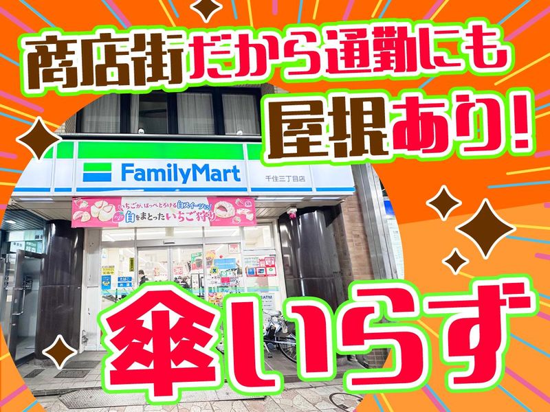 仕事内容 / 「北千住駅」徒歩5分!エキチカ! ファミリーマートスタッフ大募集★ \ ファミリーマートで一緒に 働きませんか?未経験の方も すぐに活躍できるお仕事です! ・レジ接客 ・店内清掃 ・新商品やアプリの声掛け ・商品の発注や陳列 ・売り場づくり など ワンオペの作業はありません! 分からないことがあればすぐに聞ける 環境で、フォロー体制も万全です★ ●アプリ会員獲得で報奨あり♬ モチベーションに繋がります! ●チームプレイ抜群◎スタッフ同士の 会話も多く、仲がいい職場です! ●「いらっしゃいませ!」の声が 響く、活気のあるお店です ●研修制度もしっかりしており、 ベテランスタッフもサポートしてくれる ので、未経験からでも安心して始められます。