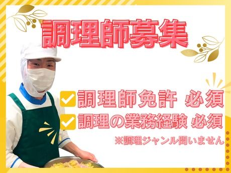 資格 【必須条件】 ★調理師免許 必須 ★調理業務の経験のある方 \こんな方は優遇いたします!/ *給食調理経験者 *飲食店キッチン経験者 (和食・洋食・中華 ジャンルは問いません) *社員食堂での勤務経験者 ◆フード業界の経験を活かせます! ◆ハローワークで求職中の人も歓迎!