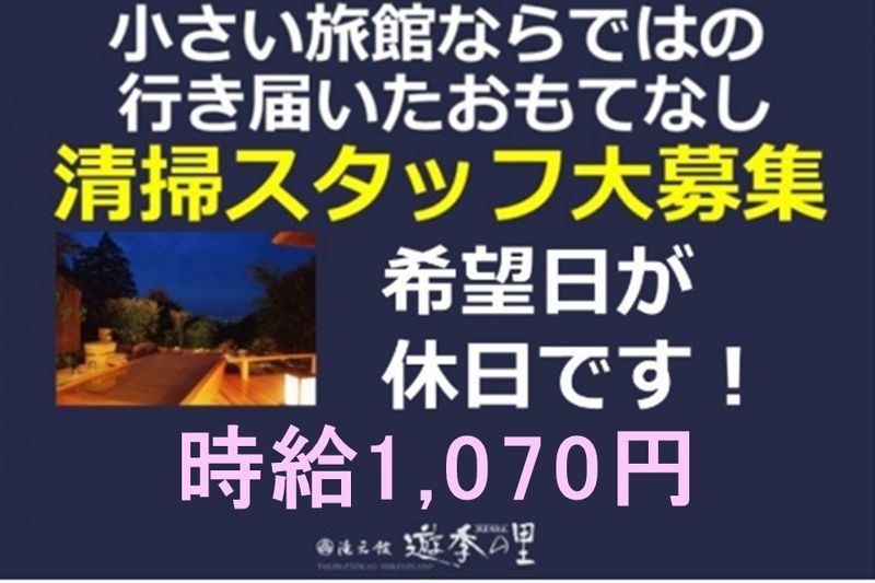 【仕事内容】 朝もやに霞むのどかな田園風景や宝石のように輝く夜景が見える当館にて、屋内の清掃スタッフを募集致します ▶日本の方が約7割ほど。年齢層は比較的高め、落ち着いたお客様が多いお宿になります。 【PRポイント】 ■休日の相談もOK ■接客なしの軽作業 ■短時間の業務です <具体的な仕事内容> ■館内の清掃、準備 ■室内浴場の清掃 ============== 安心のサポートで、 未経験でもすぐに活躍! ============== 入社した後は、先輩スタッフと一緒に仕事の流れを覚えていきます。 旅館のことでも、仕事のことでもスタッフ全員でサポートしていきますので、困ったことがあればお気兼ねなくご相談下さい。 ============ 滝元館のおもてなし ============ 滝元館 遊季の里は、全11室という小さなお宿。 そんな旅館だからこそ出来る「つかず、はなれず、さりげなく」の心配りで、お客様をおもてなしをいたします。 【求人ID-SOU】