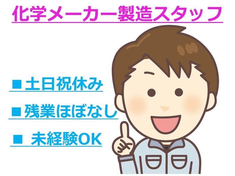 仕事内容 \この求人のポイント/ ■ 未経験から始めやすい製造業!丁寧な教育・サポート体制 ■ 日勤のみ&土日祝休みでプライベートも充実 ■ 転勤なし&車通勤OK!安定企業で長く働ける ■ 製品づくりを支える大切なポジション◎ ■ 資格・経験不問!人物重視の採用です *――+.――+.――+.――+.――* 【仕事内容】 化学メーカーの染料製造スタッフとして、染料製造や設備の操作・点検・管理をお任せします。 原料投入や製造設備の操作、梱包、機械の管理・メンテナンスなどが主な業務です。 丁寧なサポート体制が整っているので、未経験の方でも安心してスタートできます。 「モノづくりが好き」「体を動かす仕事がしたい」という方にもぴったりの環境です! ▼お仕事の流れ(STEP方式) STEP1|原料の確認・準備 当日製造分の原料や材料を準備します。 STEP2|製造機械の操作・管理 マニュアルに沿って機械を操作し、製品を製造します。 STEP3|洗浄・片付け 作業後は設備の点検や次回作業への準備を行います。 *――+.――+.――+.――+.――* 【この仕事の魅力】 ・地元で長く働ける!安定優良メーカー ・基本は定時退社◎家庭や趣味との両立もバッチリ ・マニュアル完備&先輩のサポートありで安心! ・未経験スタート多数!育成実績豊富な環境 ・ものづくりの楽しさと、社会に役立つ製品をつくるやりがい ・20代・30代の若手が多数活躍中! 頑張り次第で、キャリアアップのスピードも加速★ 頑張りがしっかり評価される職場です!